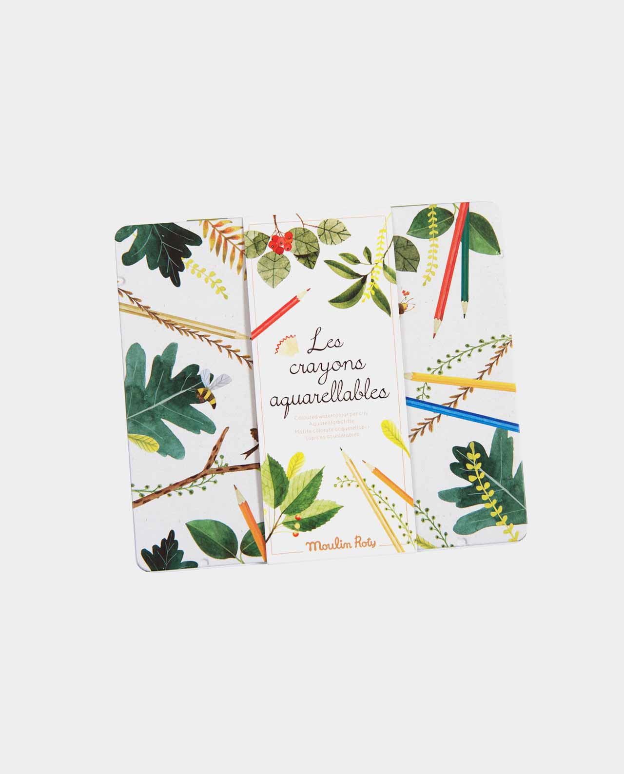 Una bonita caja ilustrada con la colección «En el Jardín» de Moulin Roty, con 24 lápices acuarelables. 24 x 22 cm. A partir de 3 años. Humedécelos con agua y ¡magia!, podrás pintar con efecto acuarela.