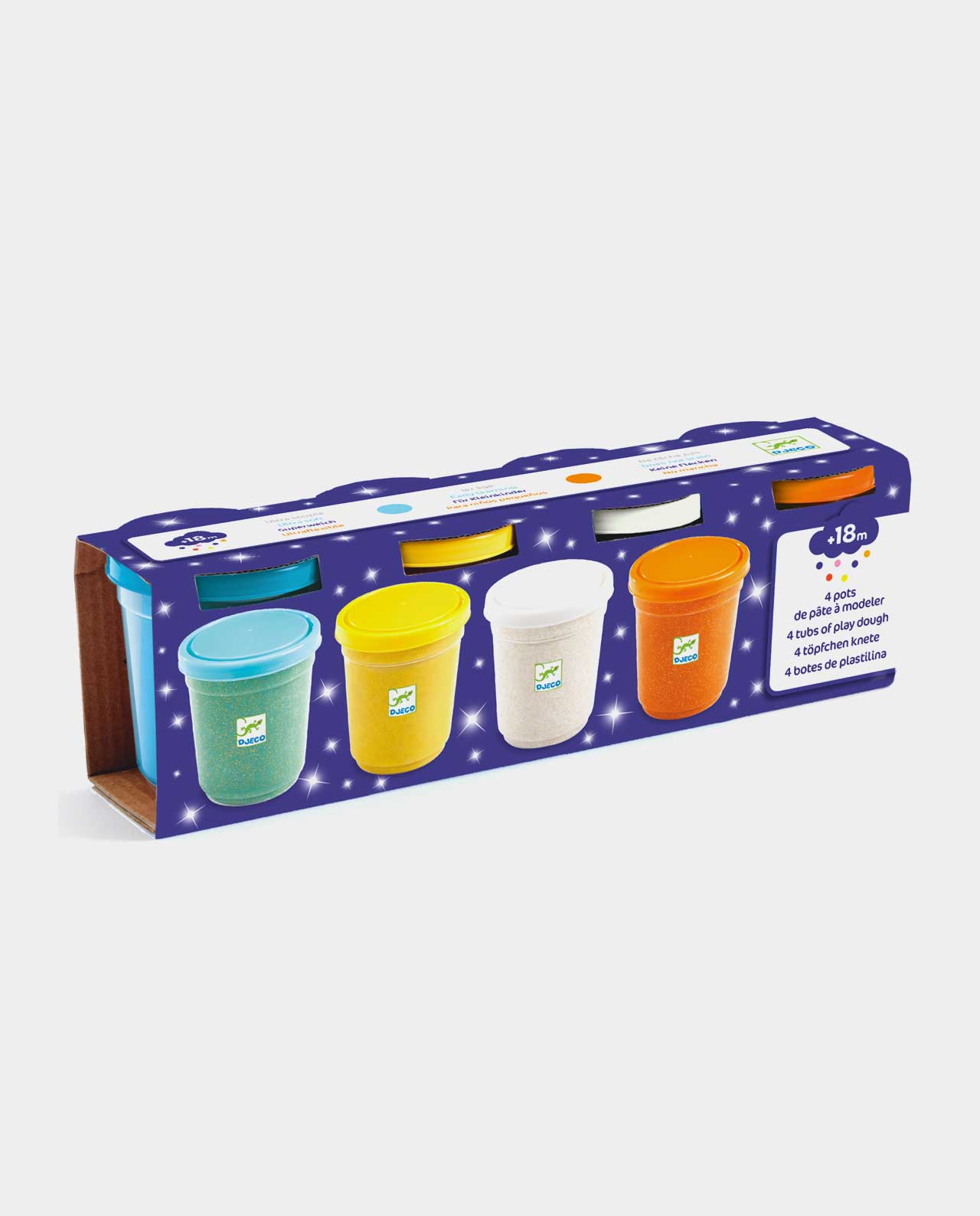 · Contiene 4 recipientes de plástico con plastilina con purpurina verde, amarillo, blanco y naranja.
