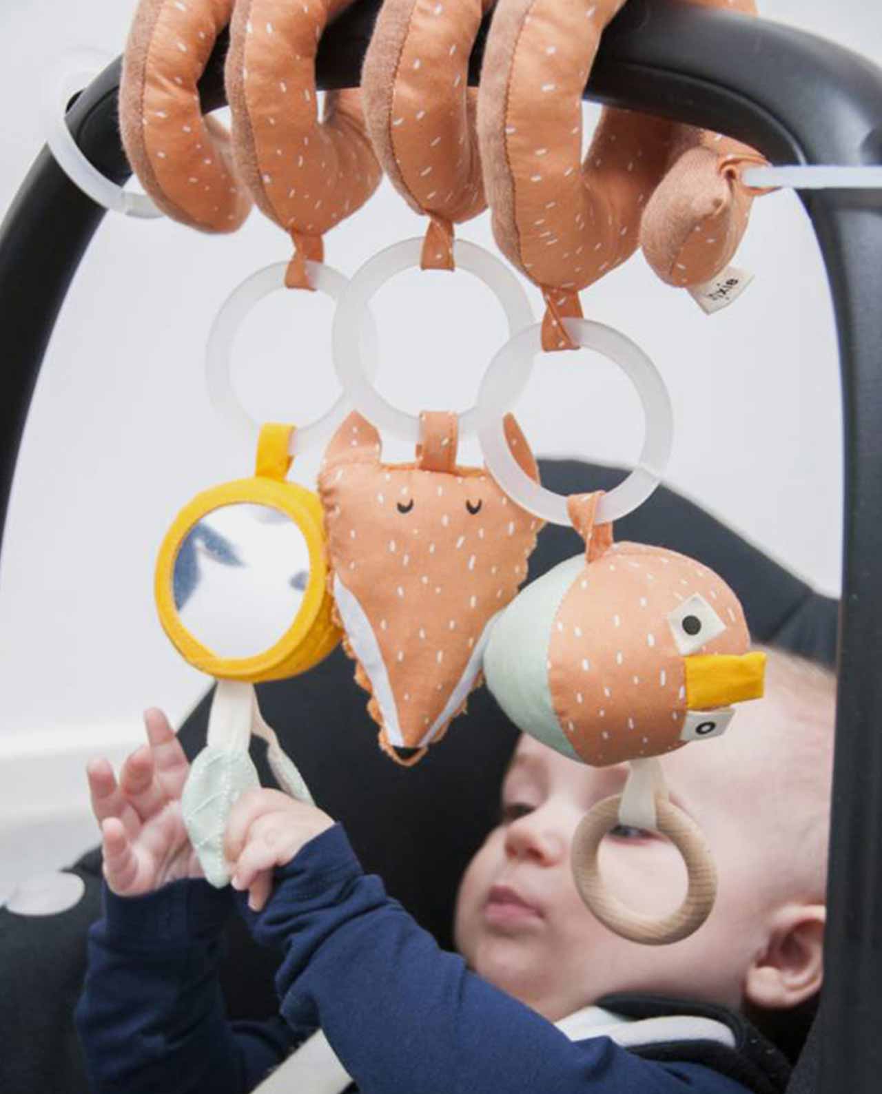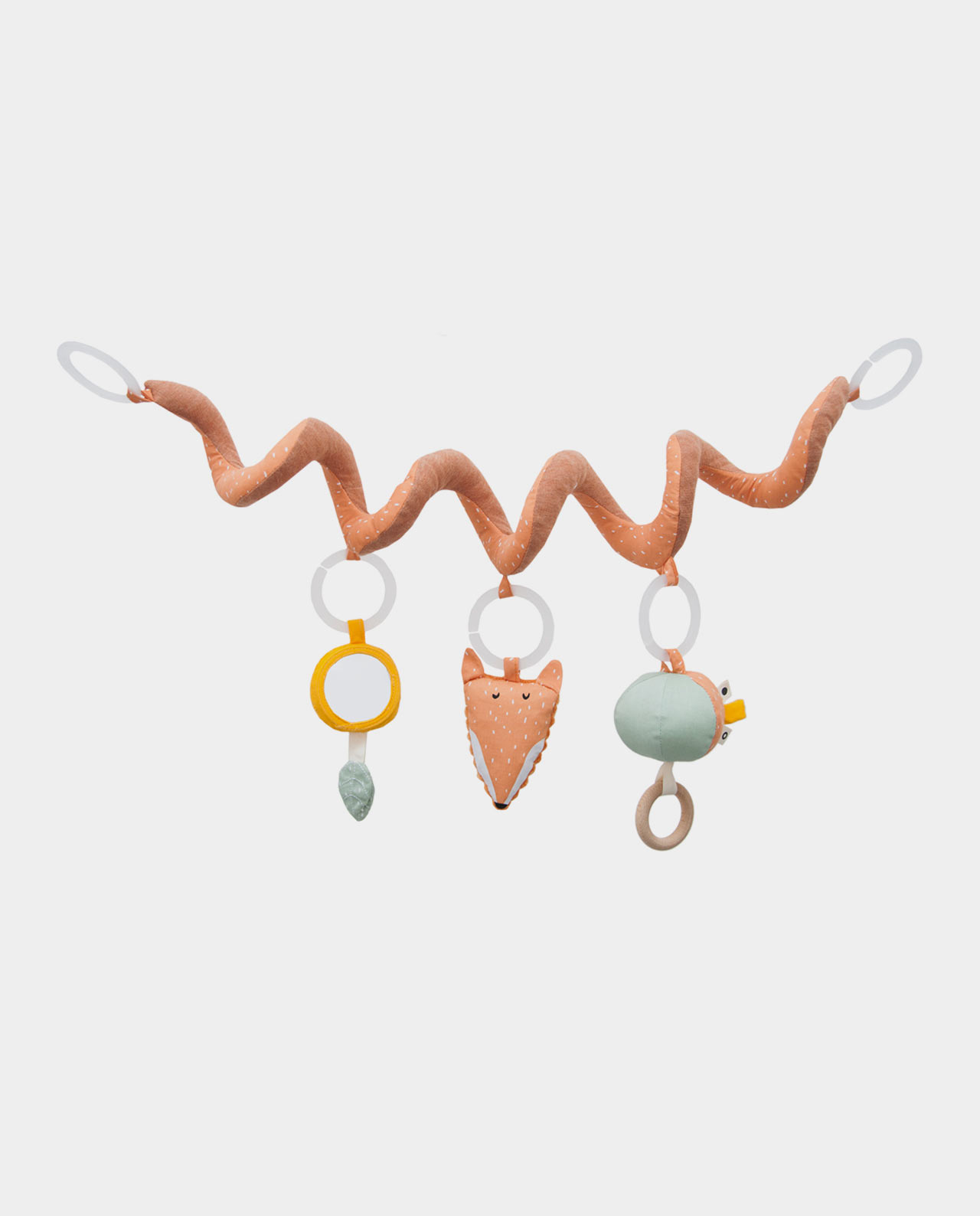 Este espiral de actividades da color al dia! Lo enrollas sin problema en cualquier silla de coche o paseo. Cada uno de los tres juguetes adjuntos tienen una función específica: un anillo de madera, papel arrugado , un espejo y una campanilla. Todos los elementos estan atados con un anillo de juguete, lo que permite fácil soltura para que pueda seguir jugando sin atar.