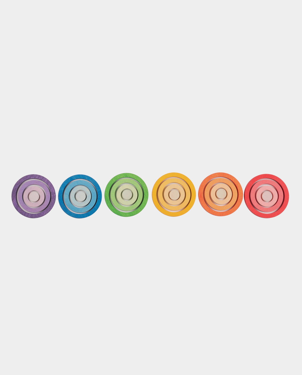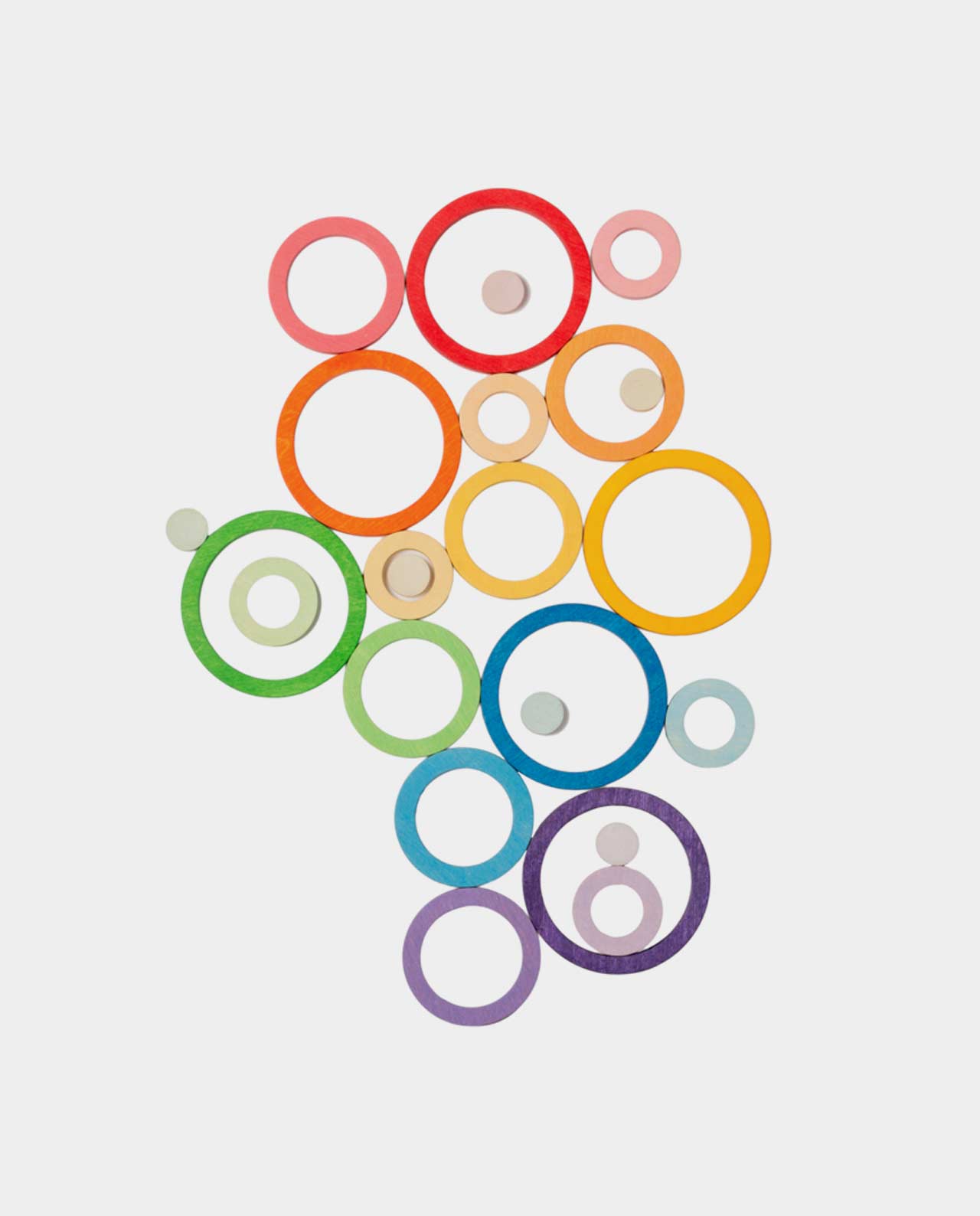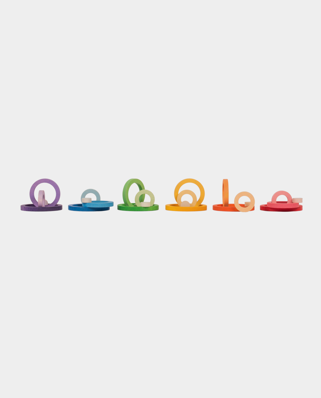 Cada color contiene 4 anillas en degradado de su tonalidad, de más luminoso al tono más claro. Puedes complementar el juego heurístico con ensartar, apilar, el esconder y el descubrir y crear diferentes juegos. Estas anillas en sus 4 diferentes medidas también permiten la clasificación, agrupación y asociación de elementos a través de su tamaño y forma, ayudando al desarrollo del pensamiento lógico-matemático.