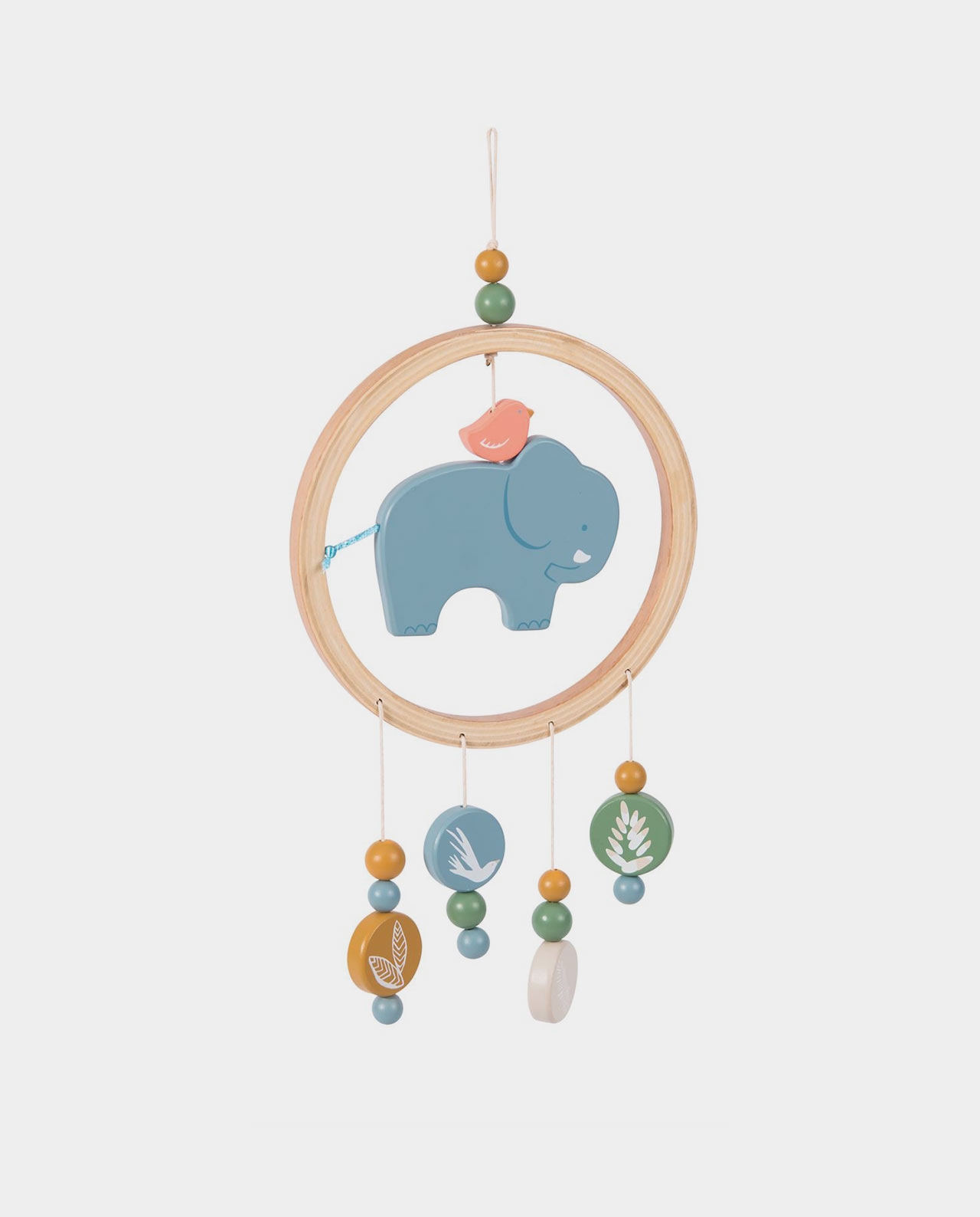 En este atrapasueños de madera el elefante Bergamote es el encargado de velar por los sueños del bebé, guardando sólo los más dulces y haciendo desaparecer las pesadillas.