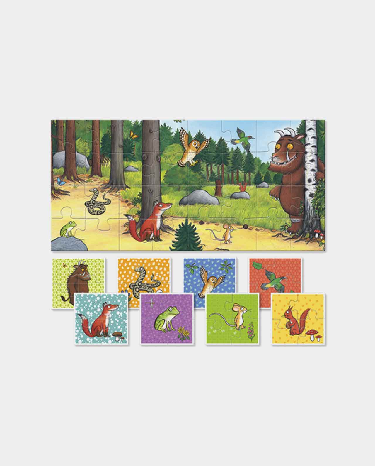 Construye preciosas imágenes de 4 piezas y ísorpresa! dáles la vuelta, únelos, y podrás observar una perfecta ilustración del Grúfalo y sus amigos.