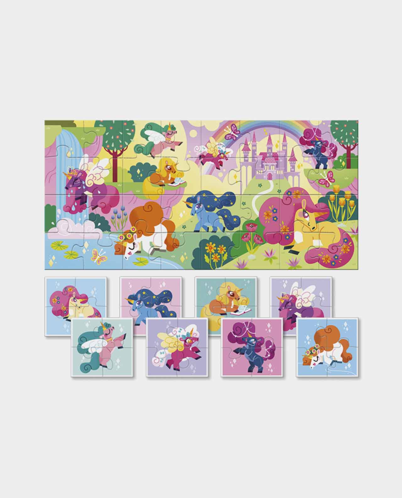 8 pequenos puzles que montar para crear simpáticos personajes! Las tarjetas son de doble cara y también permiten construir un escenario cuidadosamente ilustrado. El juego ha sido habilidades de los niños más pequeños, como la capacidad de observación y de manipulación.
