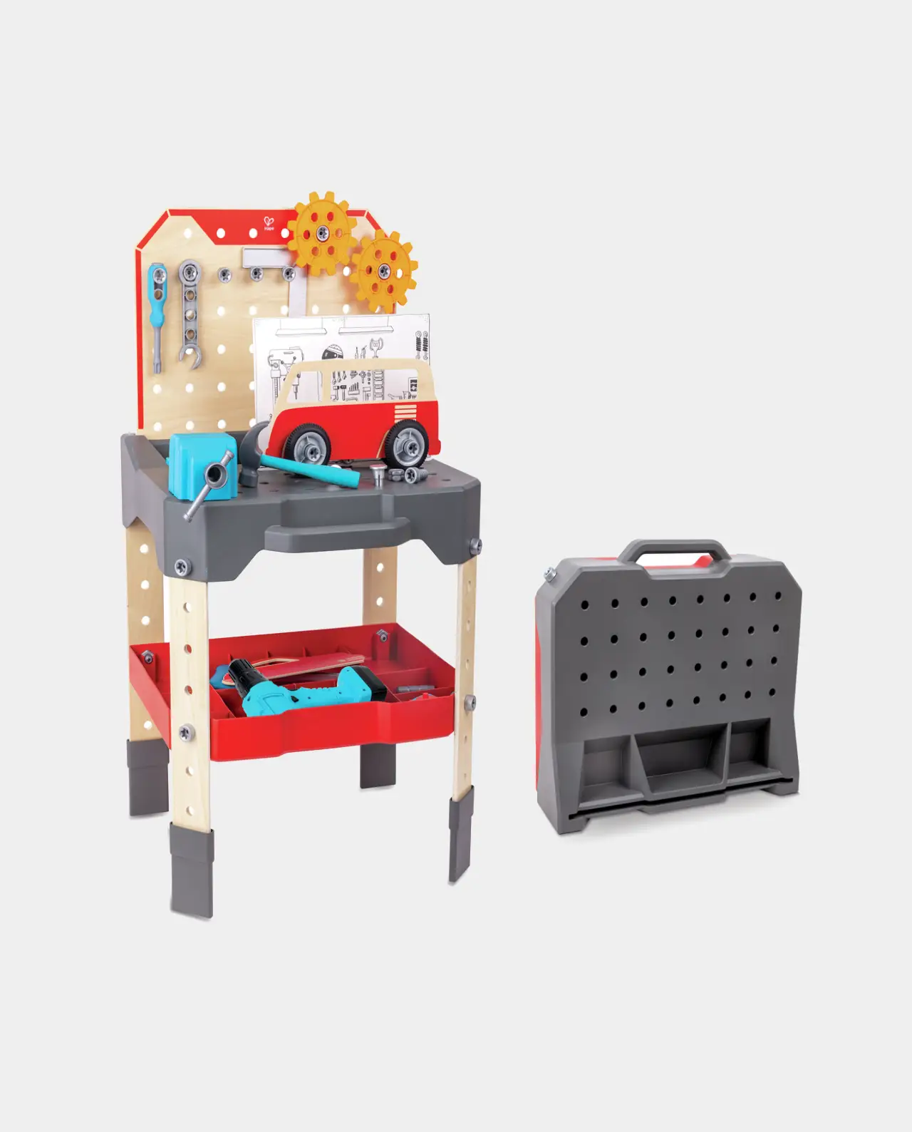 - VARIEDAD DE PIEZAS: la mesa de trabajo incluye un martillo, un taladro eléctrico, una sierra, un tornillo de banco, dos engranajes, una regla en forma de L, una llave inglesa, un destornillador, una cinta métrica, cuatro neumáticos, dos carrocerías, una escena de garaje de cartón y algunos tornillos y tuercas.