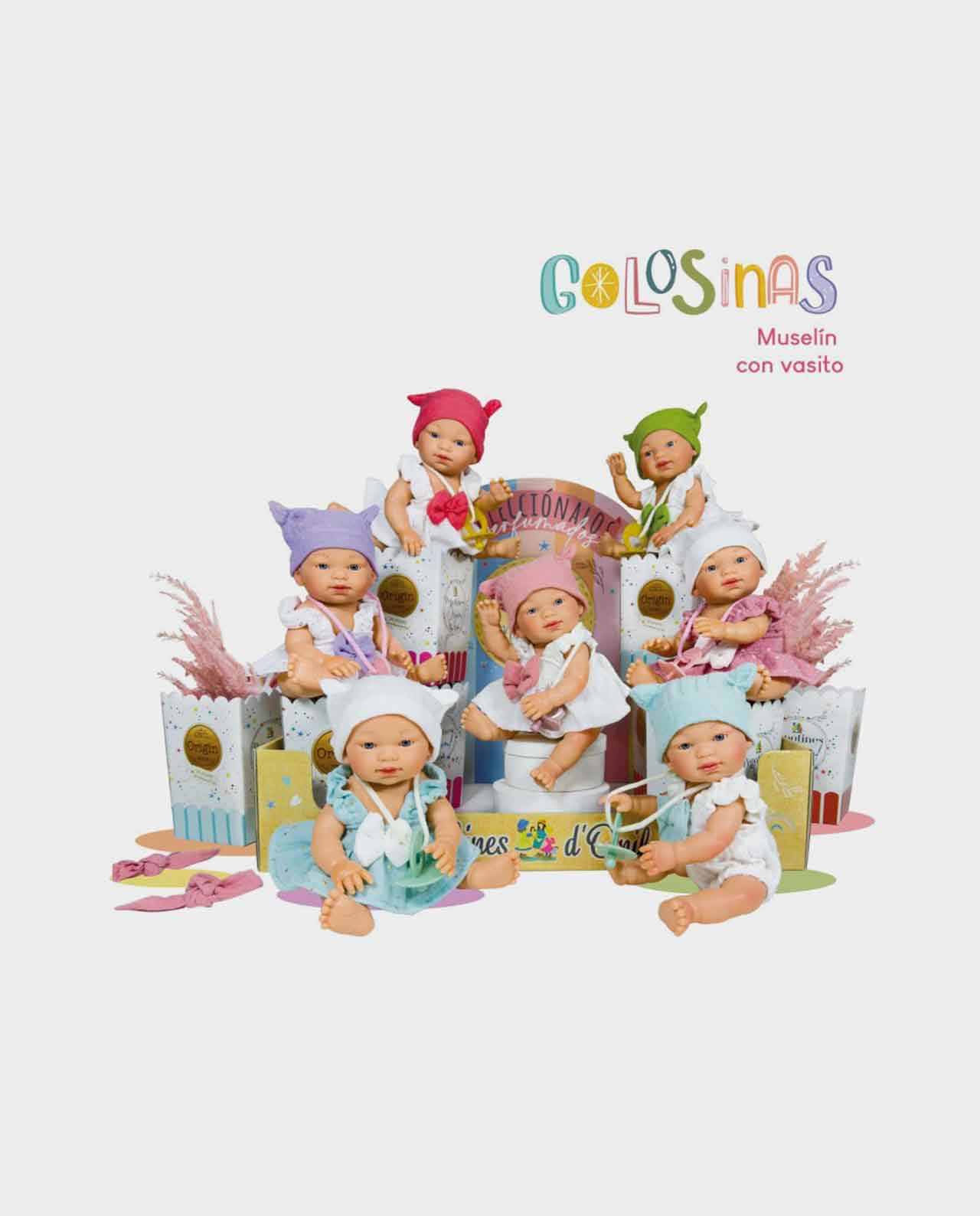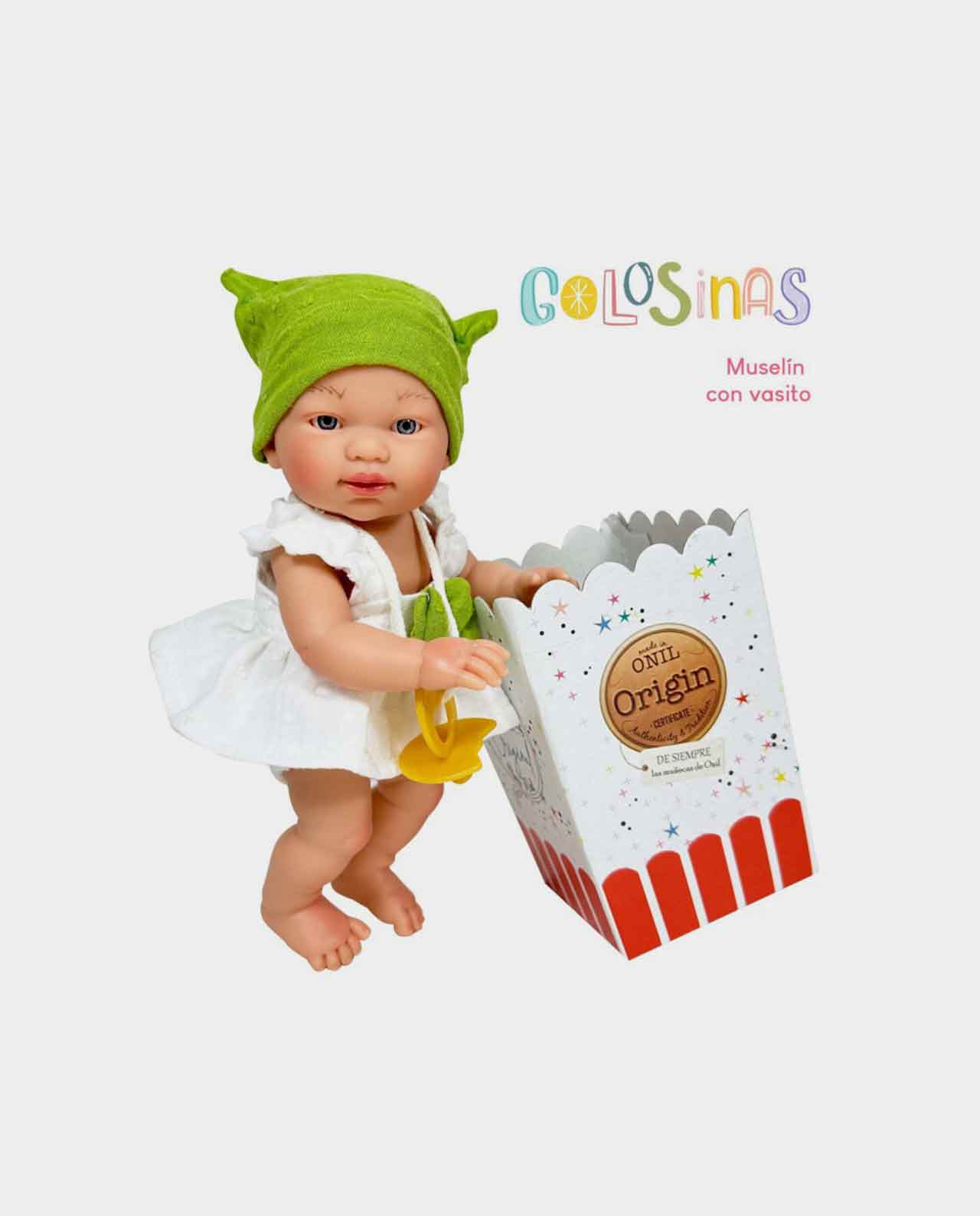 Deja que tu peque juegue con la muñeca de les Nines D’0nil. Los GOLOSINAS MUSELÍN CON VASITO miden 22cm. Son coleccionables y se pueden bañar ya que son completamente de vinilo. Es por ello que son anatómicamente correctos (sexuados). Además, desprenden un agradable aroma a vainilla.
