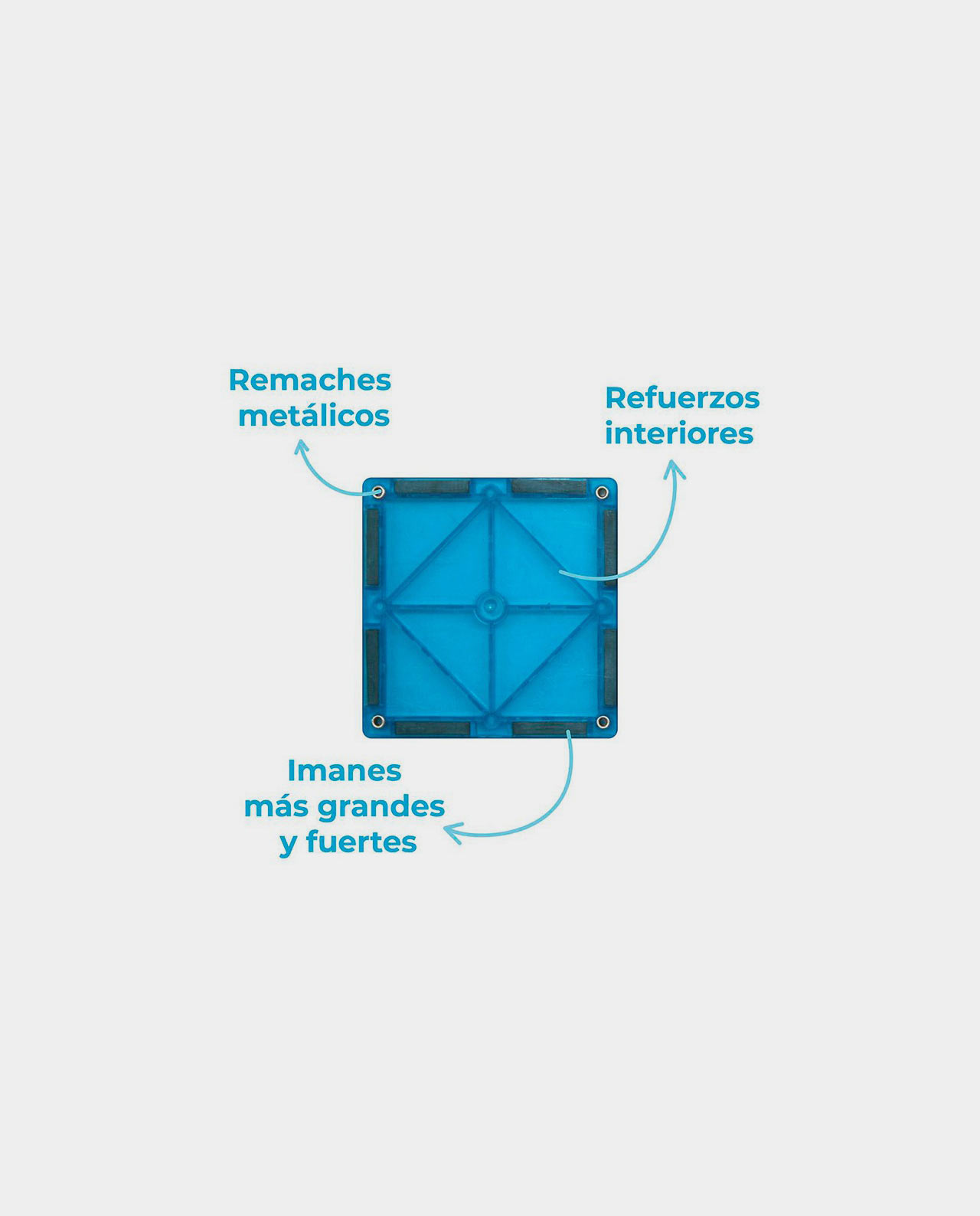 · Las piezas cuentan con refuerzos interiores y potentes y gruesos imanes que permiten una unión fuerte, aportando máxima estabilidad a las construcciones. Los lados nunca se repelen.