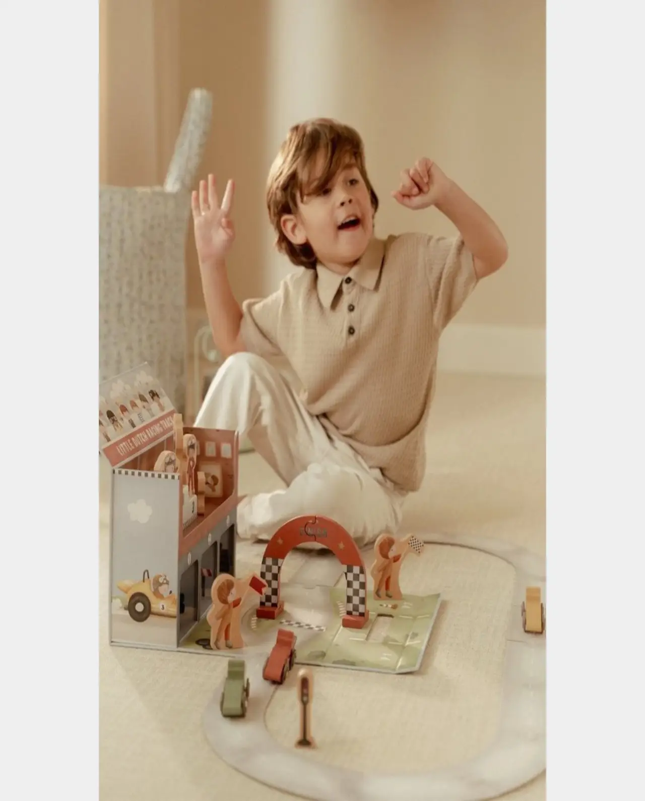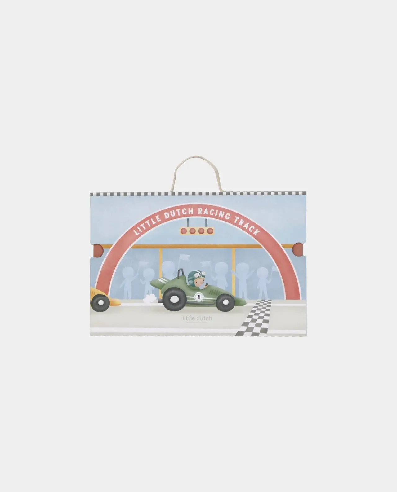 La Caja de Juego con Pista de Carreras de Little Dutch es mucho más que un estuche: se transforma en una pista completa donde los más pequeños podrán organizar sus propias competiciones.