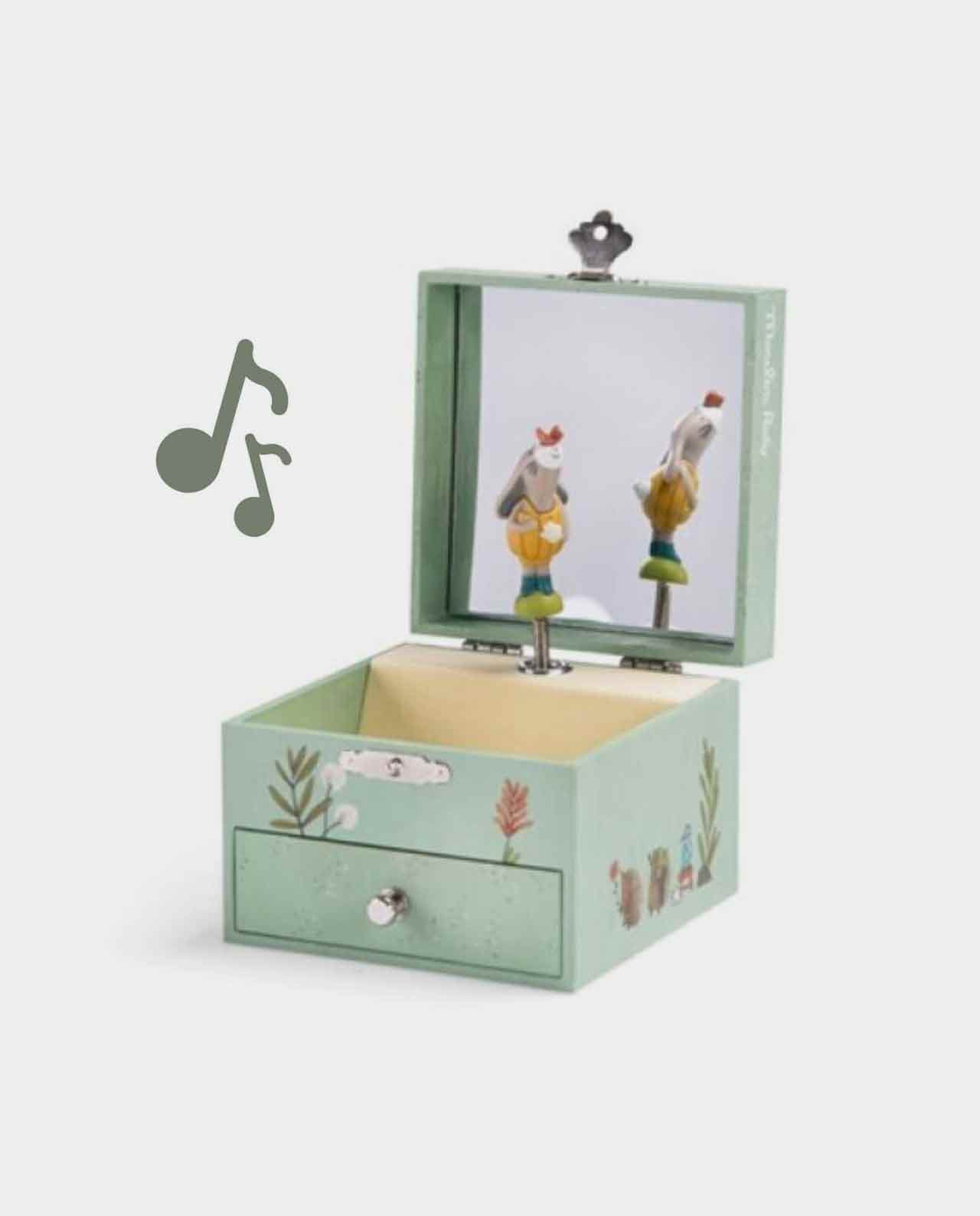 Preciosa caja de música es su interior esconde una ratita de la colección Trois Petits Lapins de Moulin Roty que gira con una dulce melodía al abrirla y girar la manivela que tiene en la parte trasera.