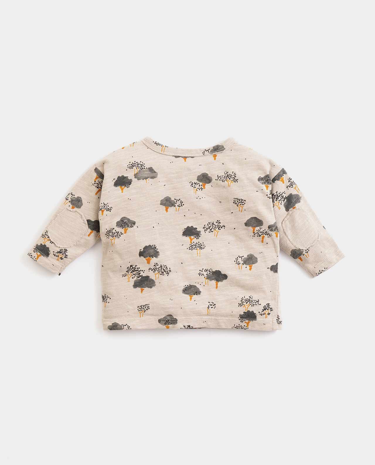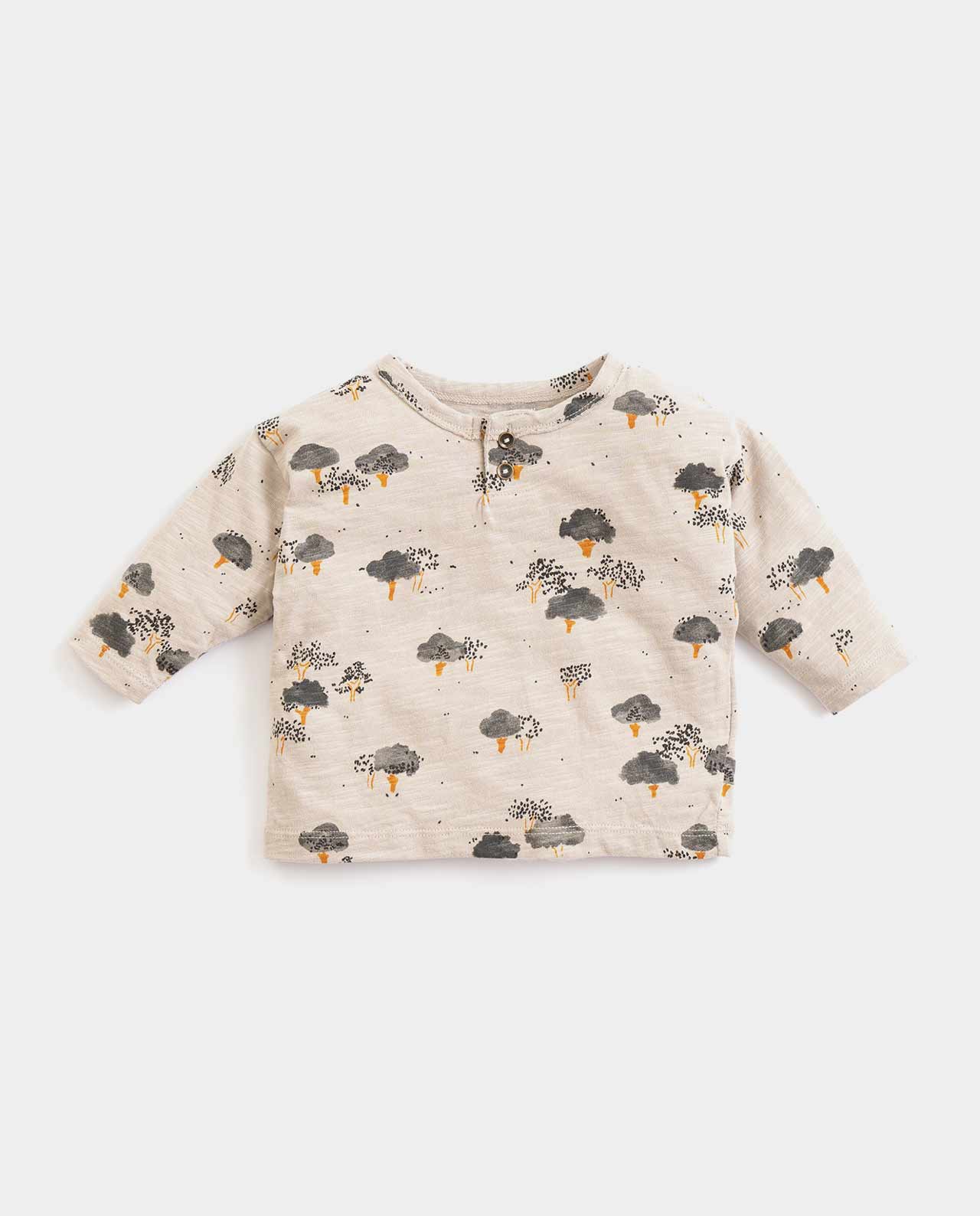 Esta camiseta está confeccionada con punto de algodón orgánico, en color Simplicity. Es un modelo con manga larga y cuello redondo, tiene una abertura frontal con botones de metal sin níquel, adorno de coderas y nuestro estampado de árboles. Todas las materias primas utilizadas en esta prenda tienen certificación Standard 100 by OEKO-TEX, convirtiéndola en un artículo libre de sustancias nocivas para la piel de los niños.