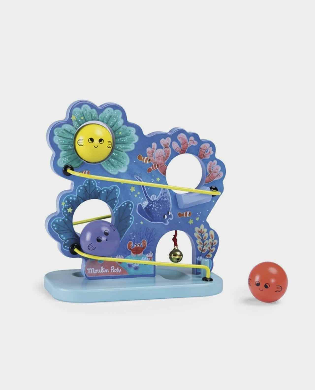 ¡Bienvenidos a los arrecifes de coral con esta hermosa cascada de madera que refleja los colores del océano! Tu bebé disfrutara al deslizar las bolitas decoradas con adorables pececitos que harán sonar la campanita al llegar abajo. Este emocionante juego incluye un set de tres coloridas bolitas que harán que la diversión y la imaginación de tu pequeño no tengan límites. Déjale explorar el mágico mundo marino mientras disfruta de este fascinante juguete.