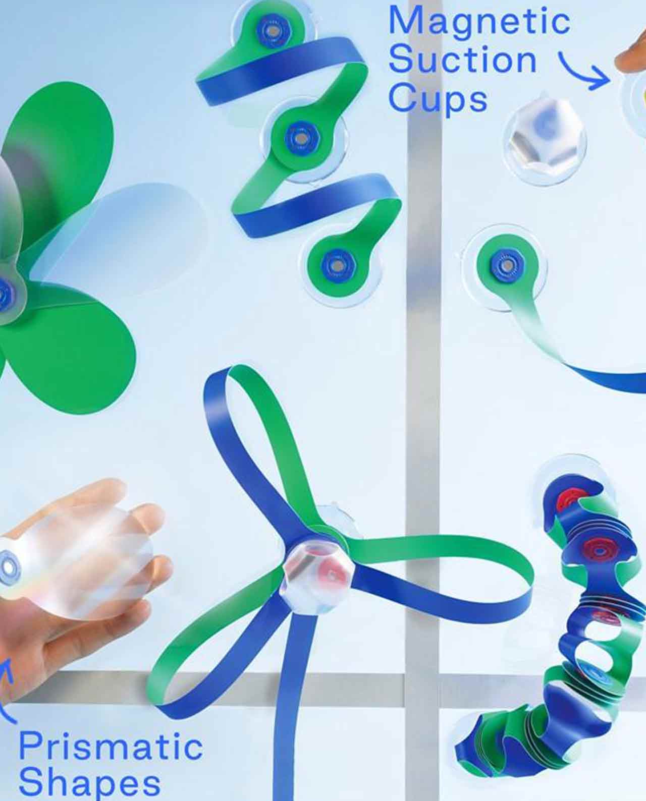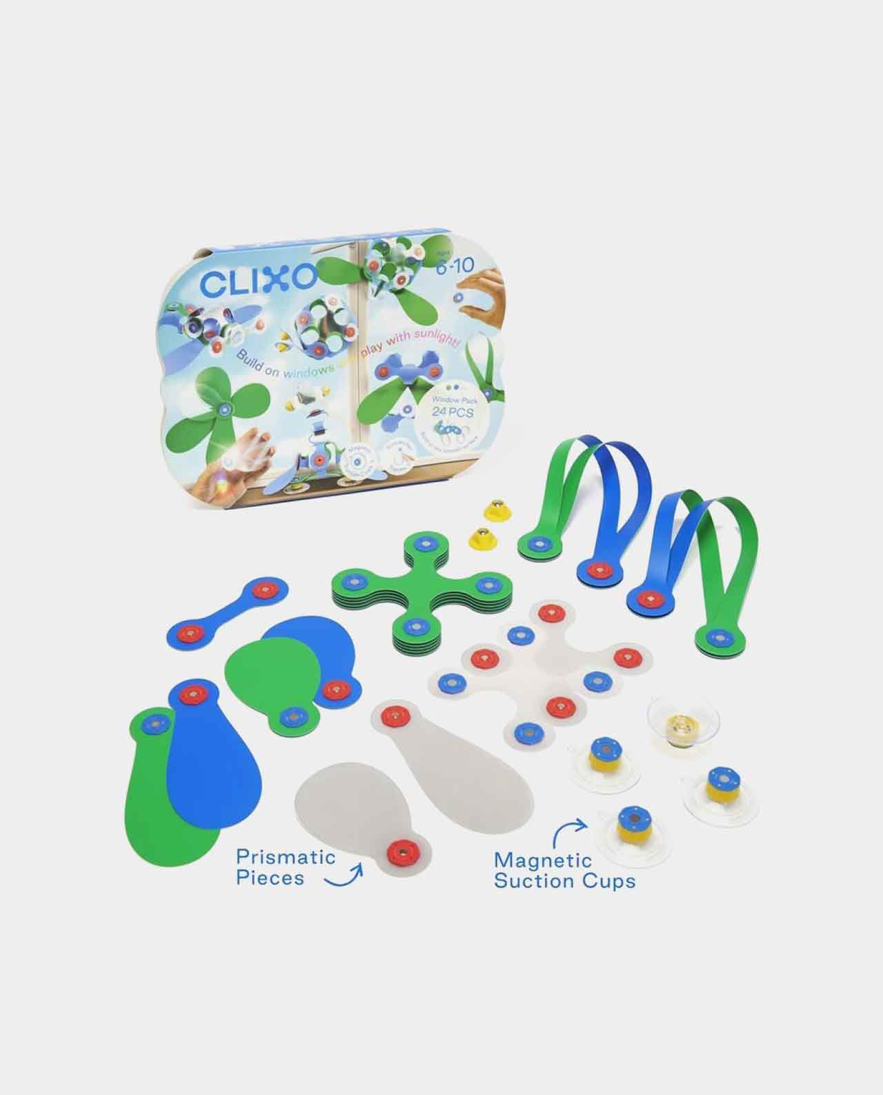 El Window pack contiene 24 piezas en 10 formas únicas de CLIXO, incluidos los accesorios de ventosa (x4). ¡Los niños podrán construir caras divertidas, tubos colgantes o estructuras en ventanas y azulejos!