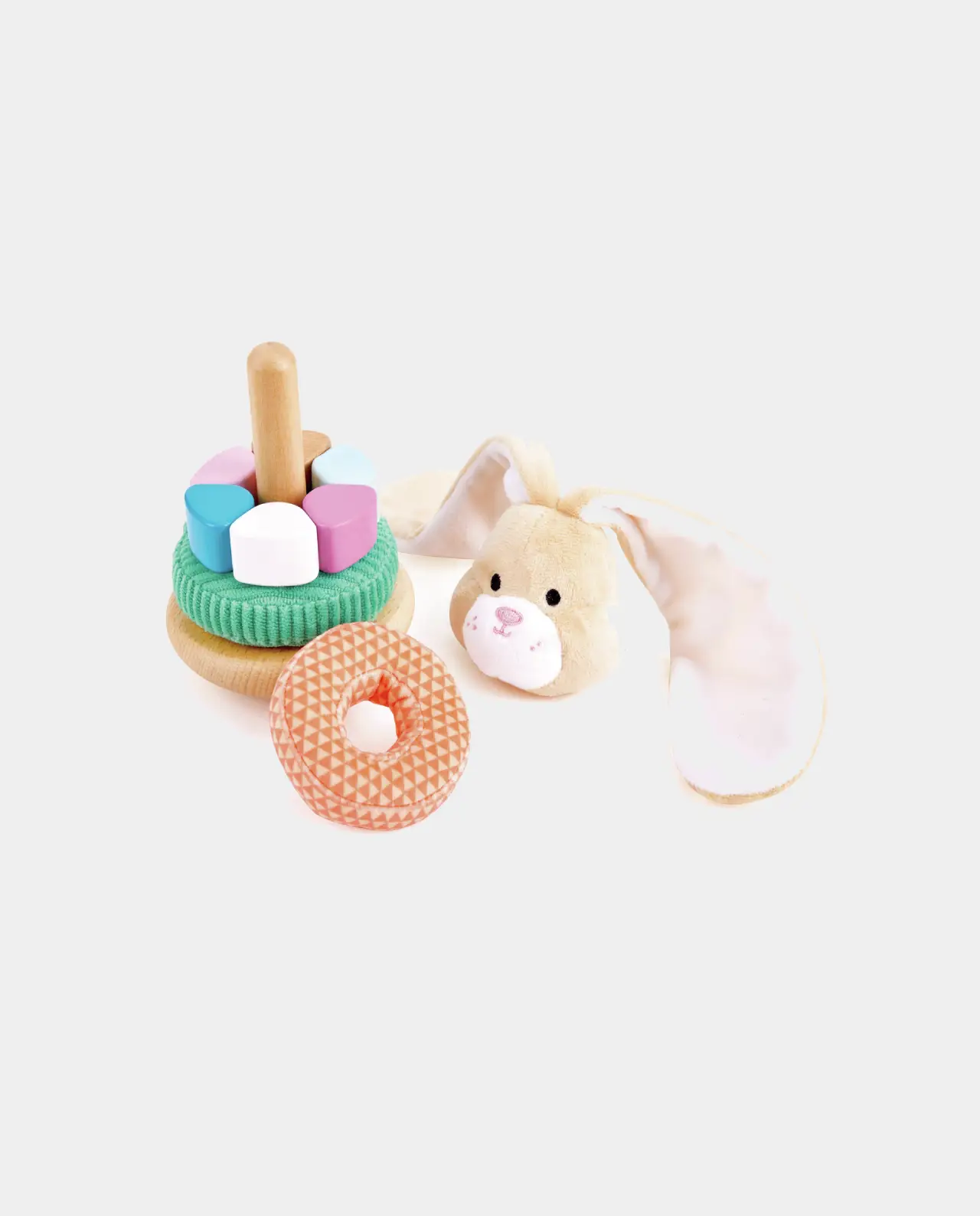 El juguete consta de cinco partes: una base hecha de madera de haya, tres anillos apilables de diferentes materiales táctiles y una cabeza de conejo blandita con orejas largas. Uno de los anillos apilables tiene una bonita cola con un pompón que puede agarrarse y también hace suaves y alegres sonidos.