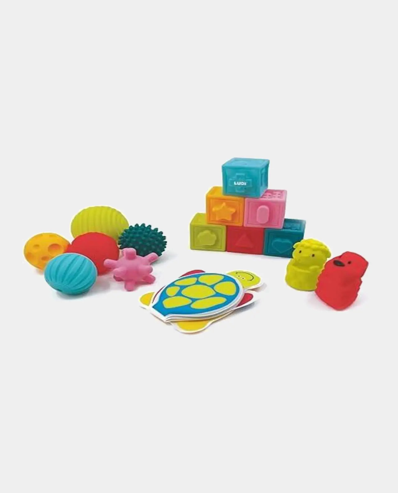 Un conjunto de 16 piezas sensoriales que estimulan el sentido del tacto, la destreza y la coordinación del/a bebé, y podrán usarlas para distintas actividades. Contienen piezas flexibles y coloridas para apilar y conectar entre ellas, ayudan a cultivar la imaginación de los más curiosos.