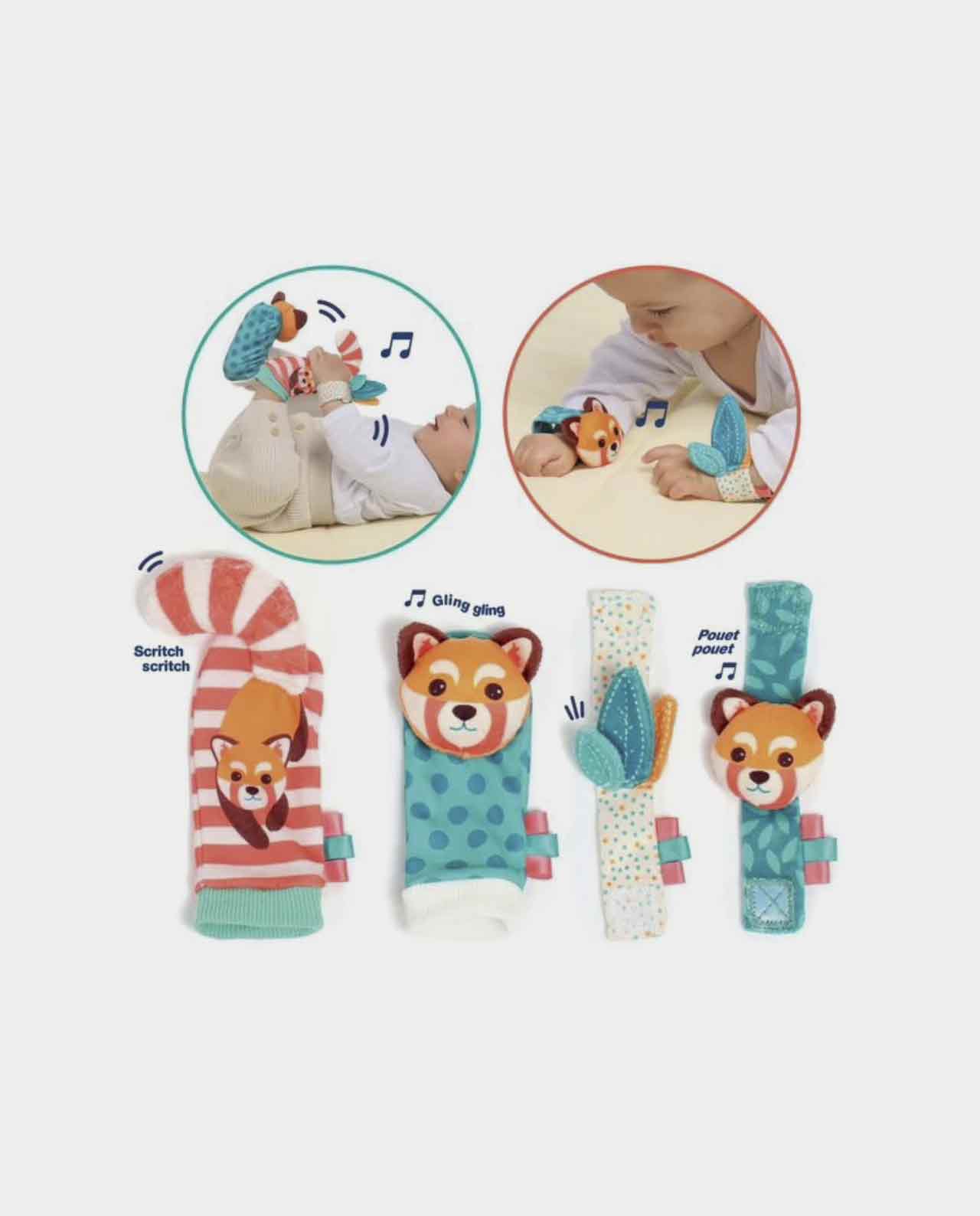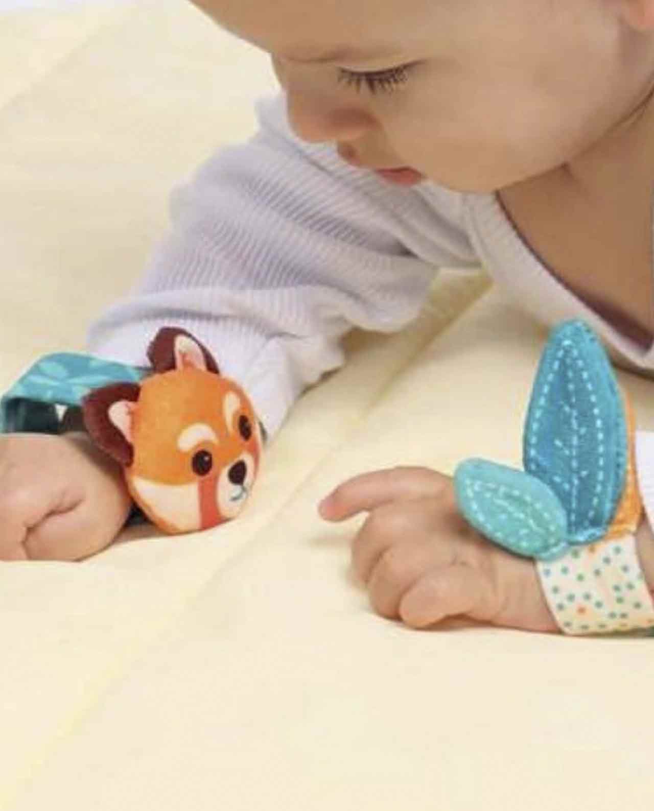 Estos adorables calcetines y muñequeras ajustables son el complemento perfecto para entretener y estimular a tu bebé. Ofrecen una variedad de actividades para estimular la motricidad y el despertar de tu bebé, incluyendo múltiples texturas, papel arrugado, un cascabel, un chirriador y cintas para explorar.