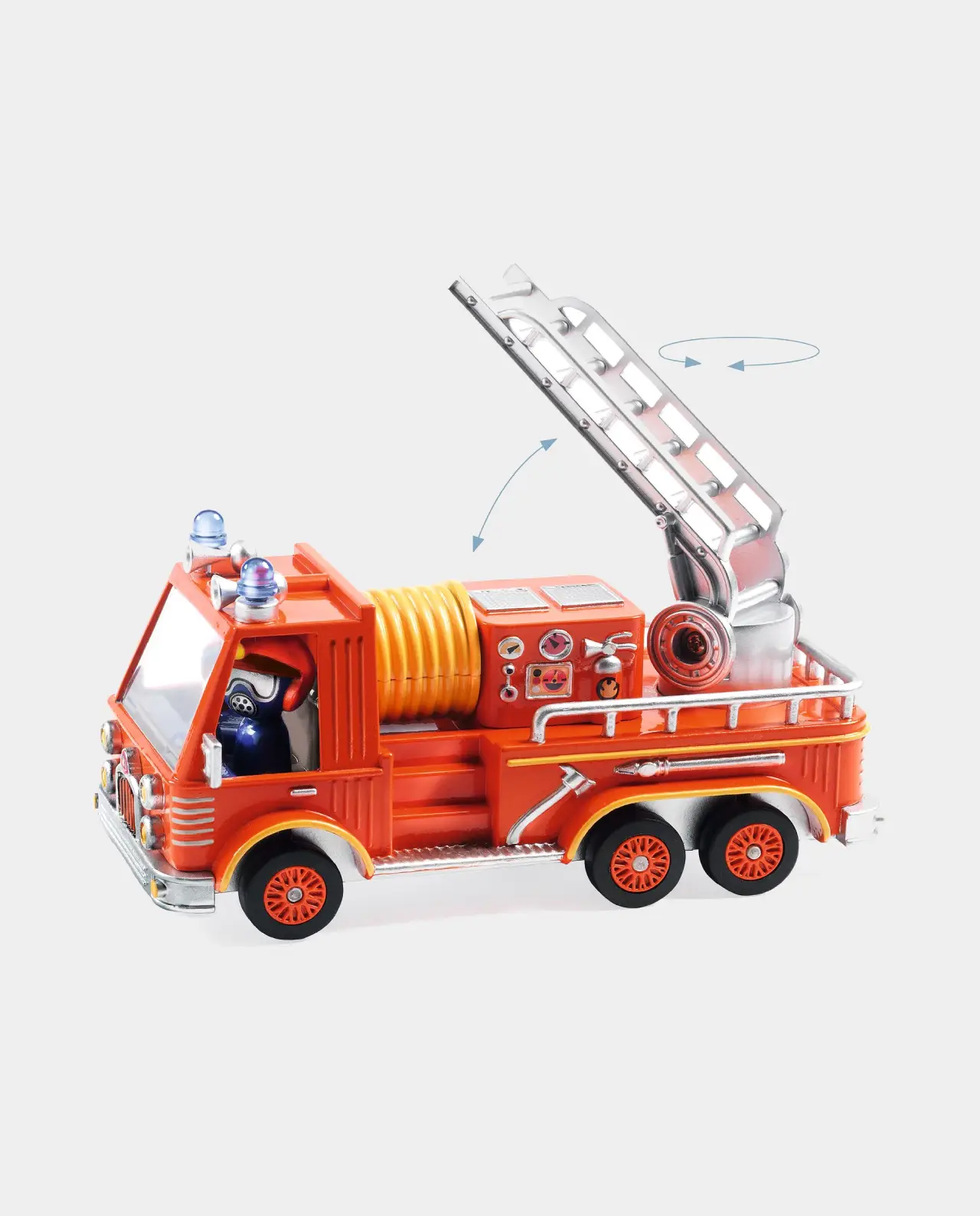 ¿Alerta de incendio! ¡Suena la sirena en el cuartel ! Captain Fire sale a toda velocidad para llegar al lugar del siniestro lo más rápido posible. Se sacó la escalera y los bomberos llegaron a tiempo para apagar las llamas. ?Buen trabajo!