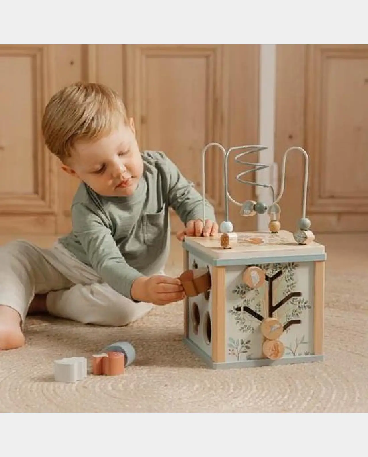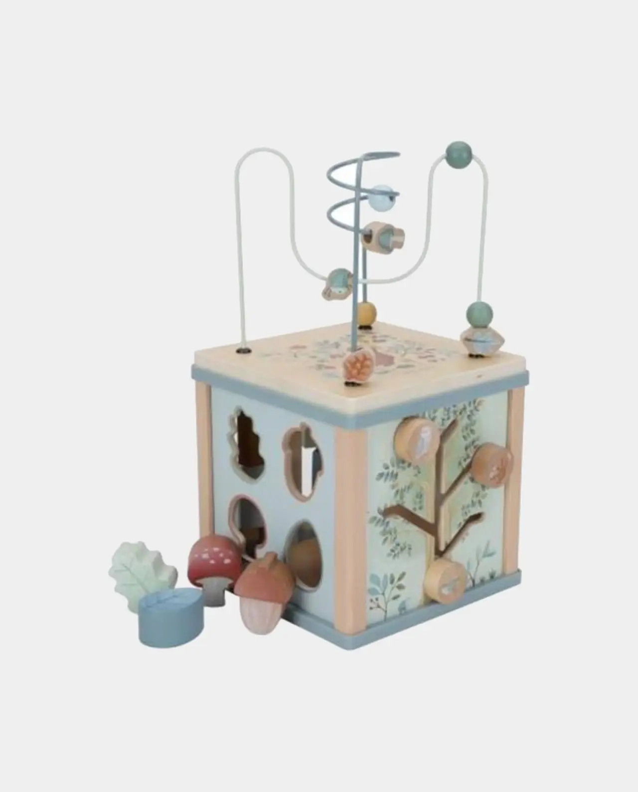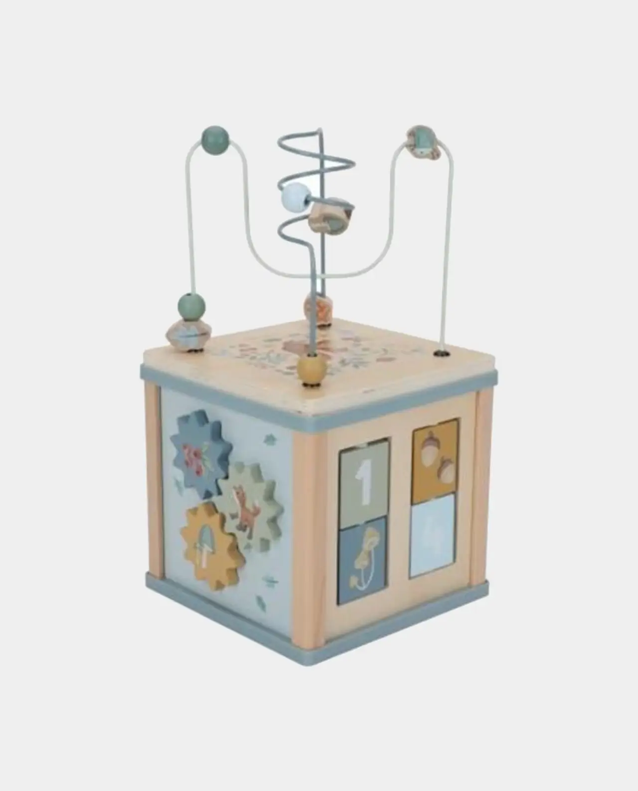 Este cubo plantea un sinfín de retos a tu pequeño. Cada lado tiene una actividad educacional diferente como reconocimiento de formas, ruedas giratorias…y un divertido laberinto espiral en la parte superior.