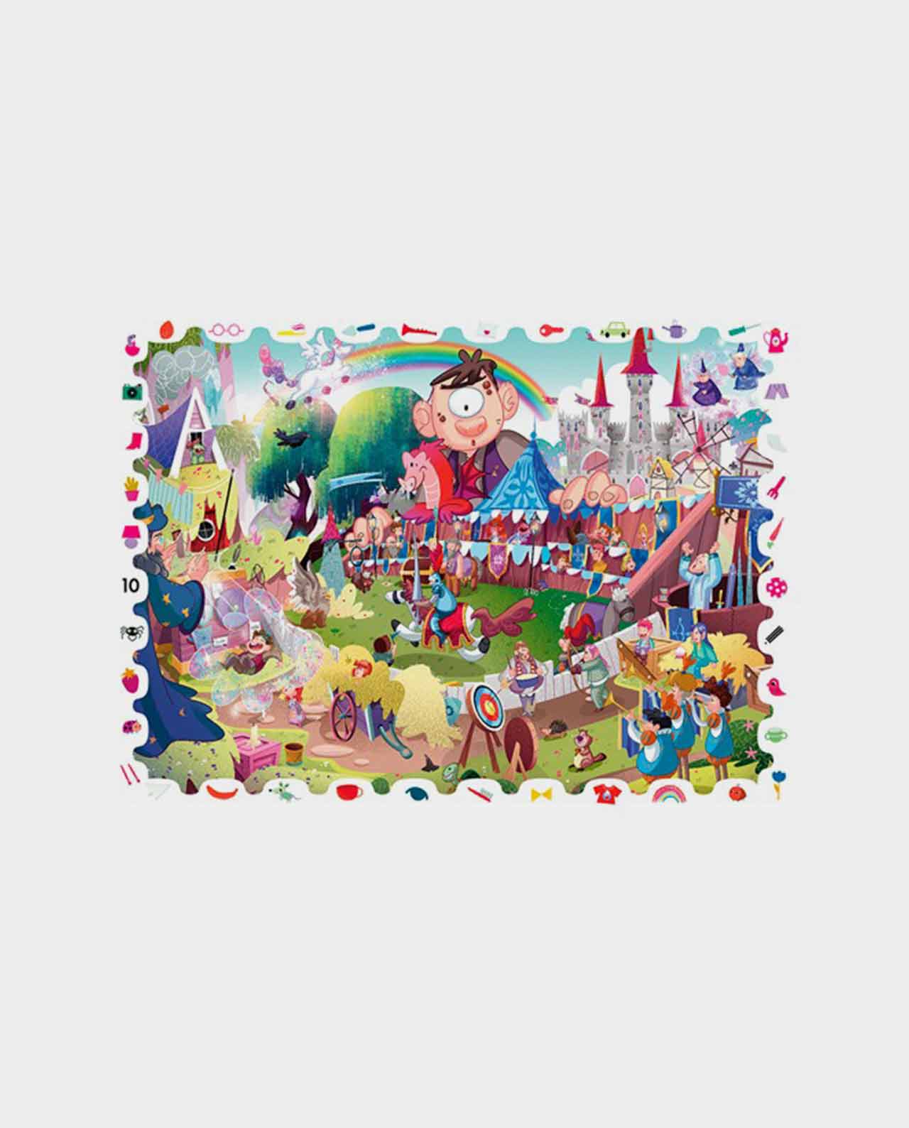 Con este puzzle de 108 piezas nos transportamos directamente a un mundo de cuento lleno de personajes fantáticos. Una vez terminado, íla diversión continúa con un juego de detectives! Prepara la lupa de madera especial para encontrar todos los objetos ocultos y disfruta de un rato lleno de magia. Un rompecabezas ideal para desarrollar la motricidad, la capacidad de observación, el lenguaje y la imaginación.