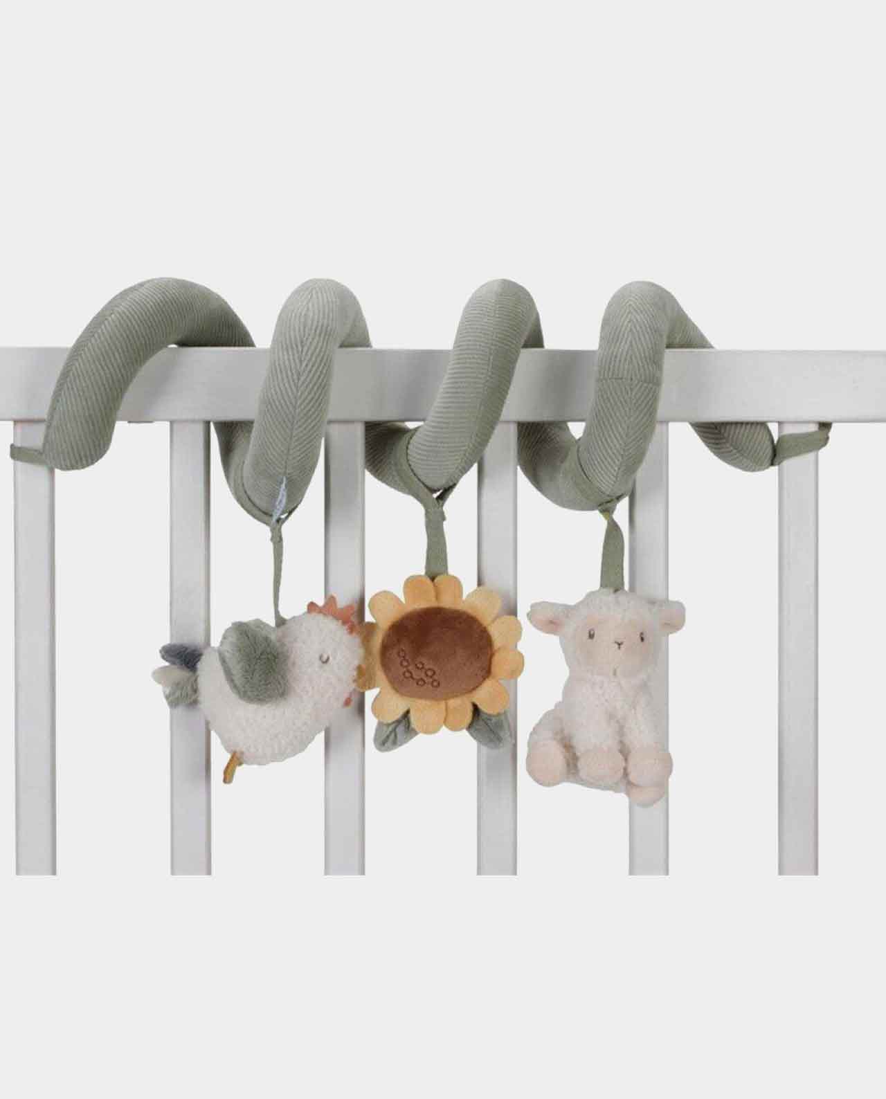 ¡Los bebés adorarán esta espiral de actividades! Hecha de suave pana y algodón, presenta tres personajes sensoriales distintos: una gallina, una ovejita y un girasol con sonido de traqueteo.