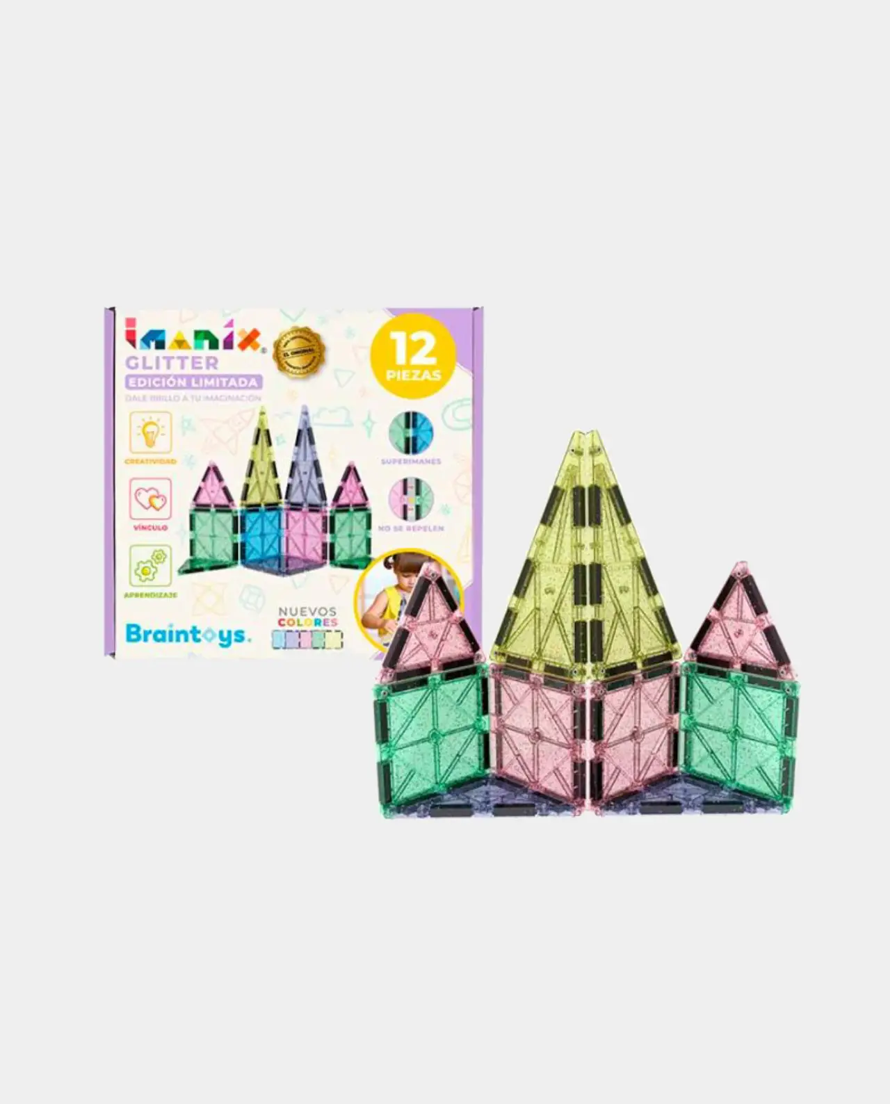 Juego de construcción magnético Imanix con 12 piezas translúcidas de colores con purpurina, de Braintoys.
