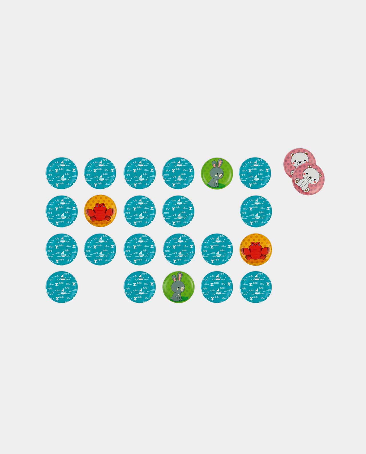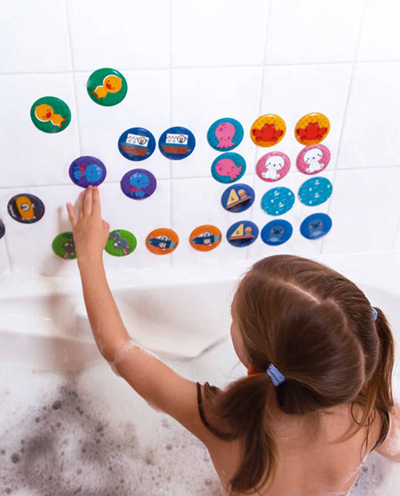 Juego de memoria de 24 tarjetas de espuma que flotan en el agua, ideal para jugar en el baño. Son mágicas, sumerge las piezas en el agua para que se queden sujetas en los azulejos.