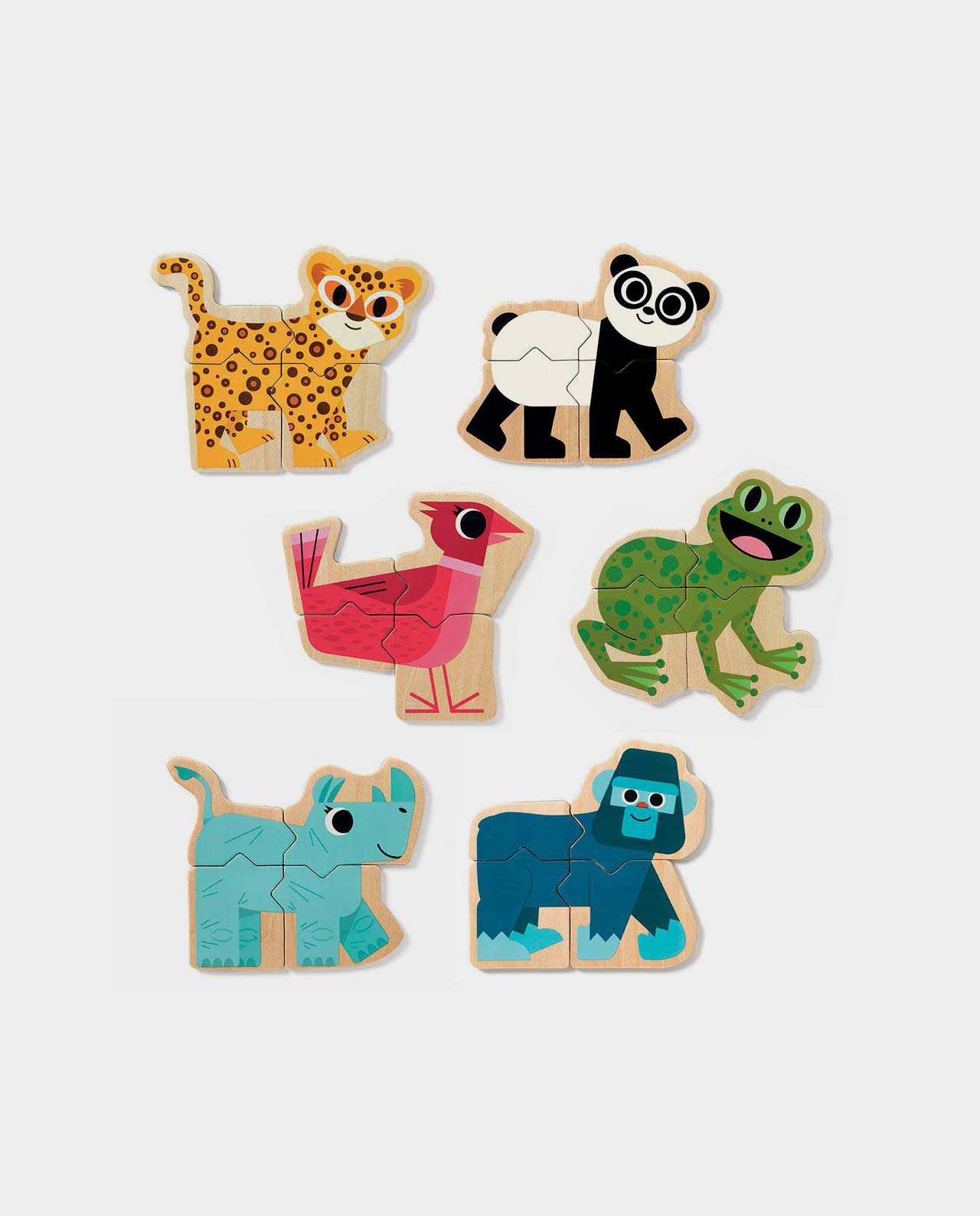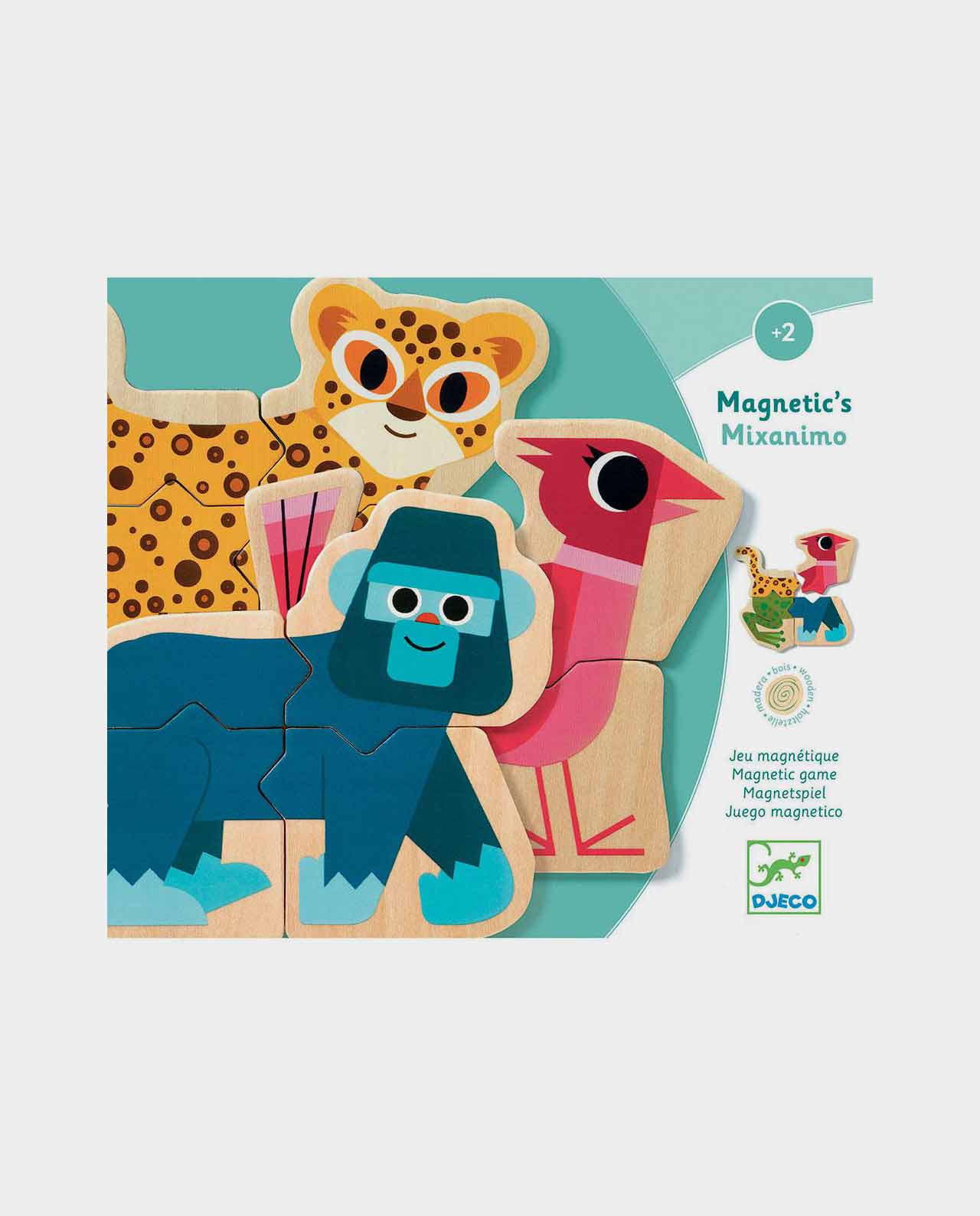 En Mixanimo encontrarás una caja de imanes de madera para divertirse formando un guepardo, un panda, un pájaro, una rana, un rinoceronte y un gorila, cada uno con un color dominante que facilita su asociación. Cada animal se forma con 4 piezas de madera encajables gracias a su forma en zigzag, fáciles de agarrar y manipular con manos pequeñas.
