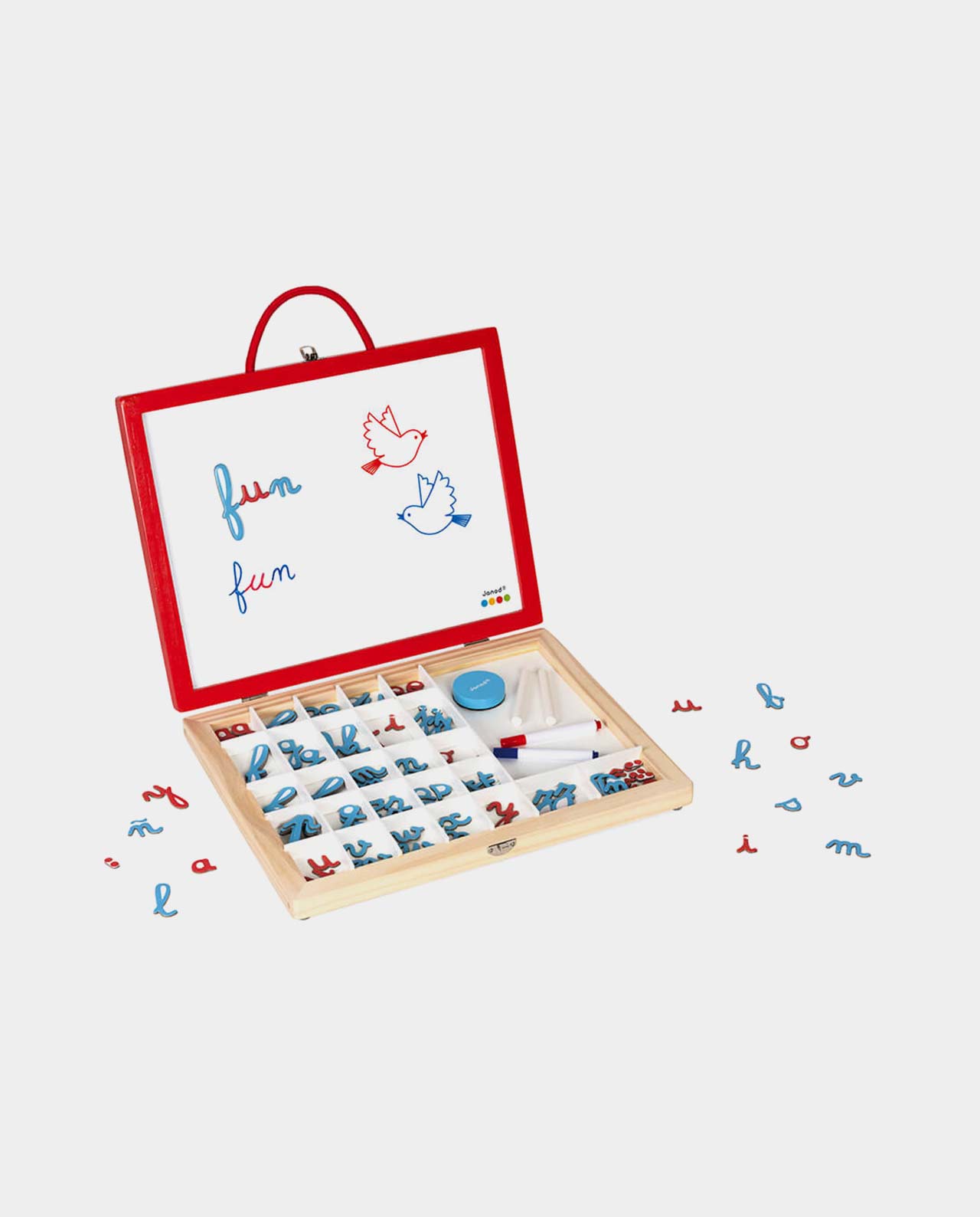 En la escuela infantil, los niños descubren poco a poco las letras cursivas o manuscritas. Para ayudarles en ese aprendizaje, este lúdico maletín tan práctico permitirá a los más pequeños divertirse con el abecedario. Contienen 4 actividades en 1: Un lado magnético para reconocer las letras y aprender el alfabeto; compartimentos para ordenar y guardar las letras y los accesorios; una pizarra blanca borrable magnética para aprender a escribir sus primeras palabras; y una pizarra negra para practicar la escritura con tiza.
