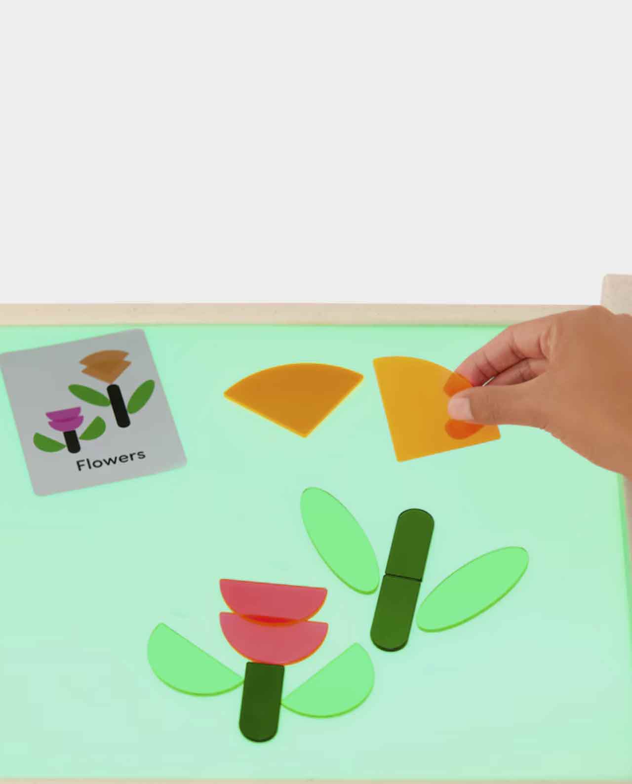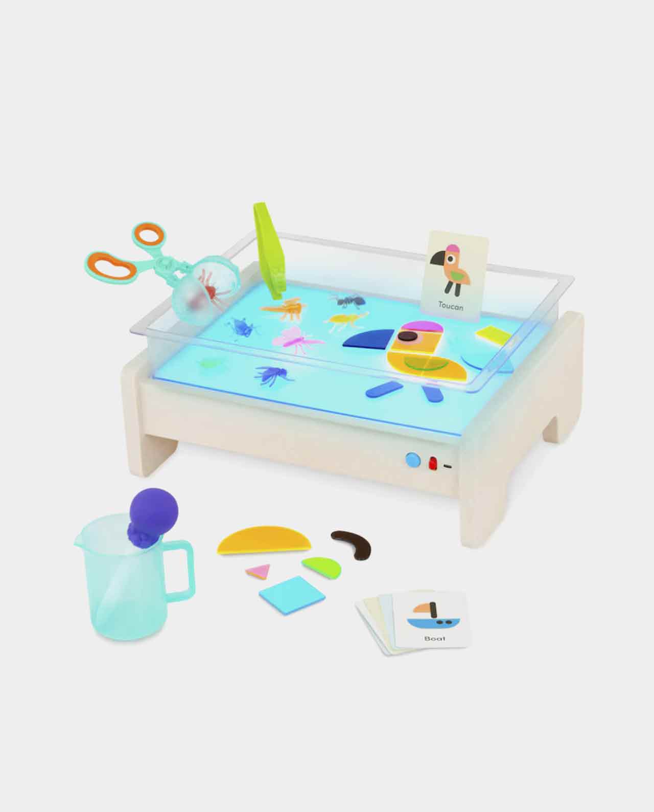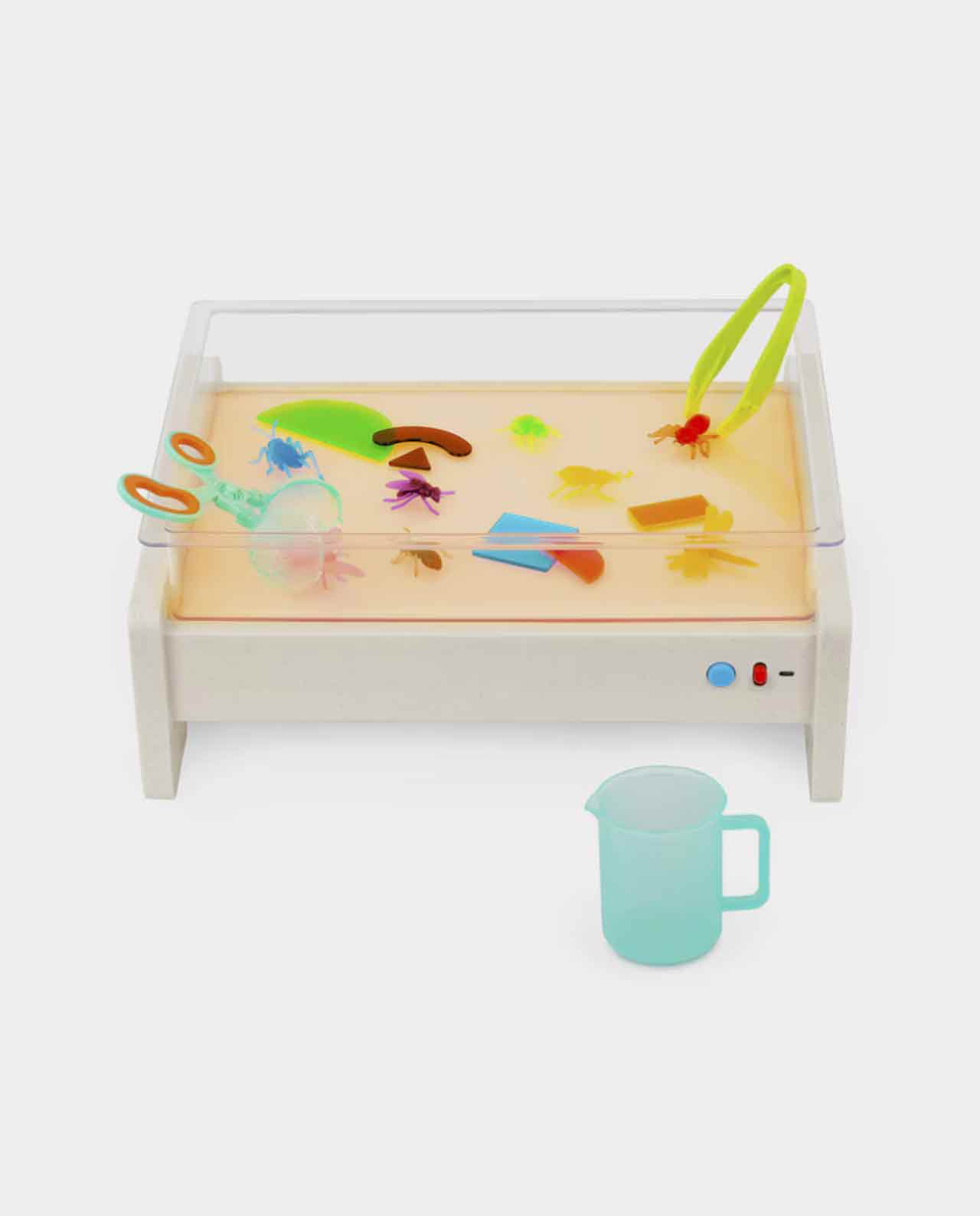 Viene con formas translúcidas y bichos para explorar mientras la luz resalta el tamaño, el color y la textura de las piezas, lo que puede ayudar a los niños a desarrollar su percepción visual y habilidades de observación. ¡Incluso hay un recipiente sensorial que puedes llenar con papel triturado (incluido), agua, arena o arroz!