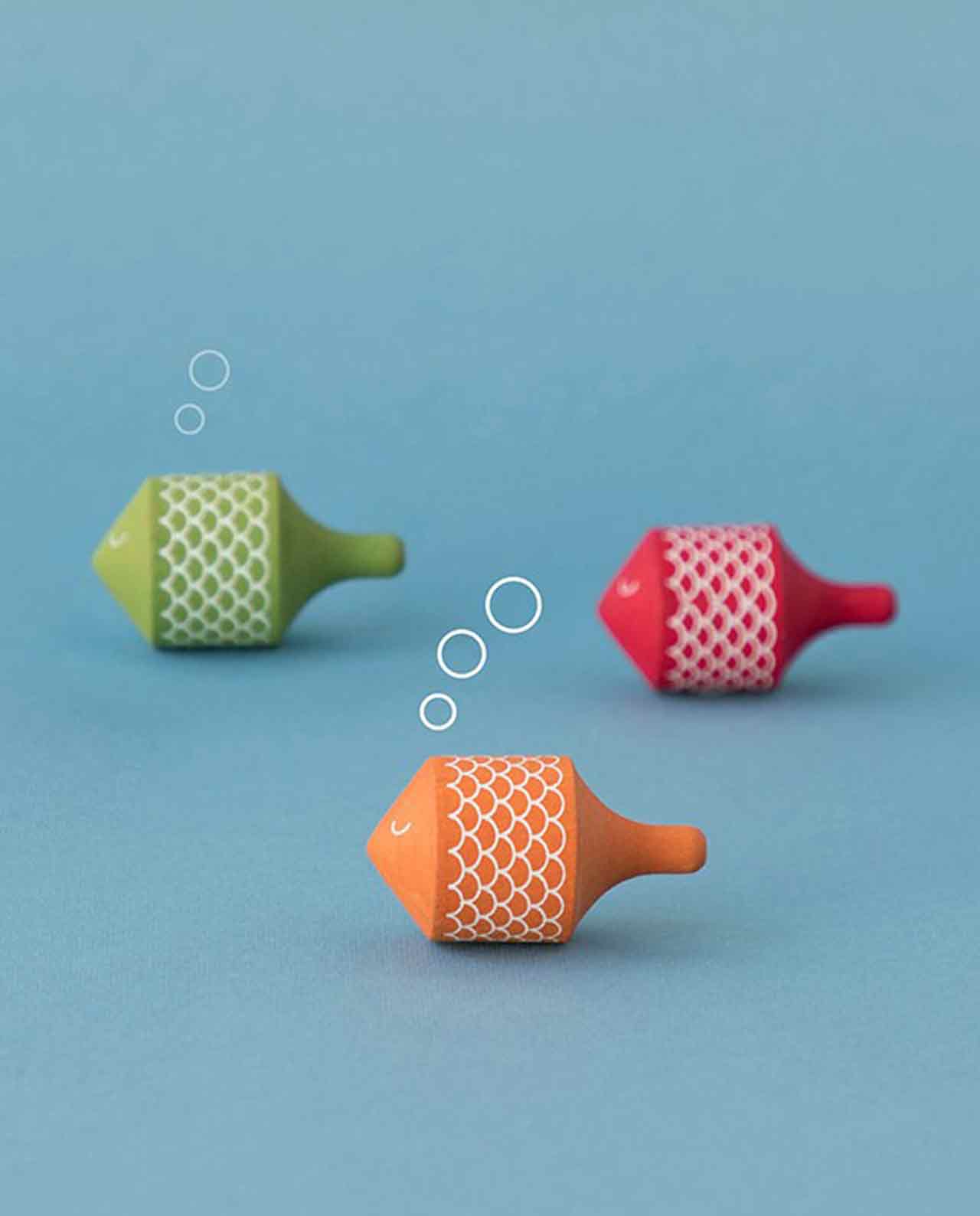 Unas peonzas de madera de haya con forma de pez coloreadas con tintes al agua. Un juguete de proximidad, seguro y sostenible.