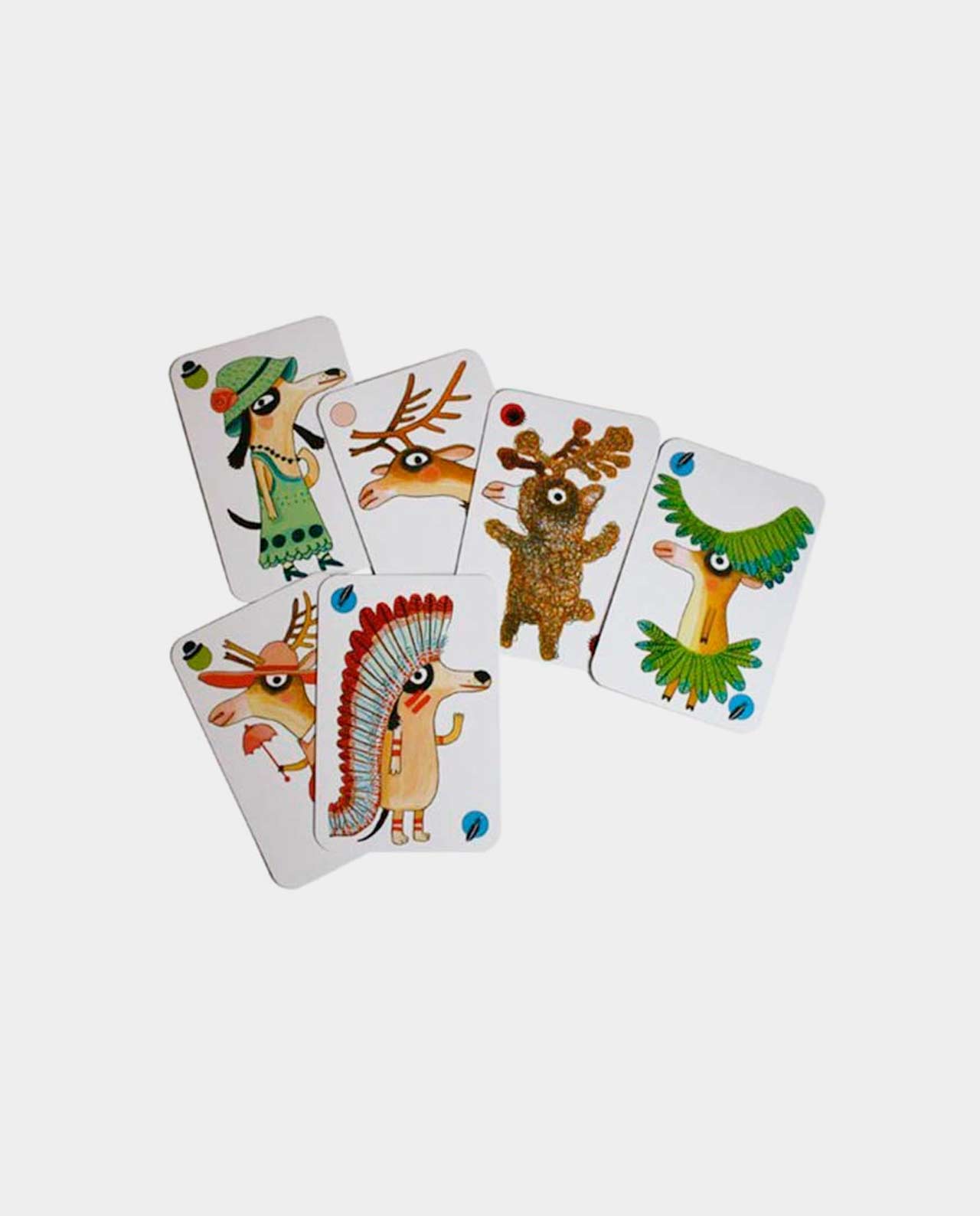 · Incluye 44 cartas: 10 cartas “peludo”, 10 cartas “desnudo”, 10 cartas “con plumas”, 10 cartas “vestido” y 4 cartas comodín.