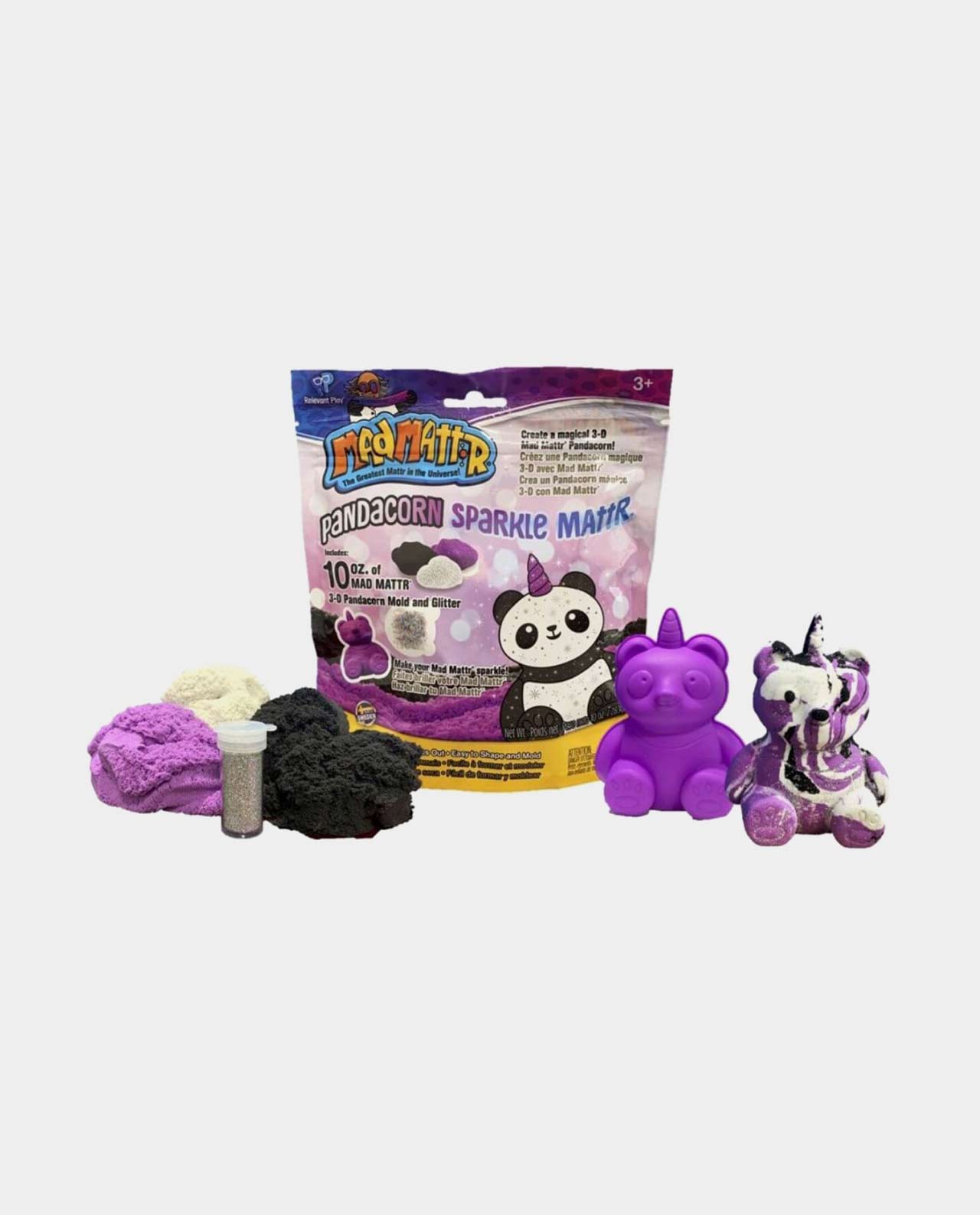 Crea tu propio pandacornio de arena mágica con este kit que incluye todo lo que necesitas: arena de tres colores (lila, negro y blanco), purpurina y un molde con forma de pandacornio. Ideal para desarrollar la motricidad fina y la imaginación.