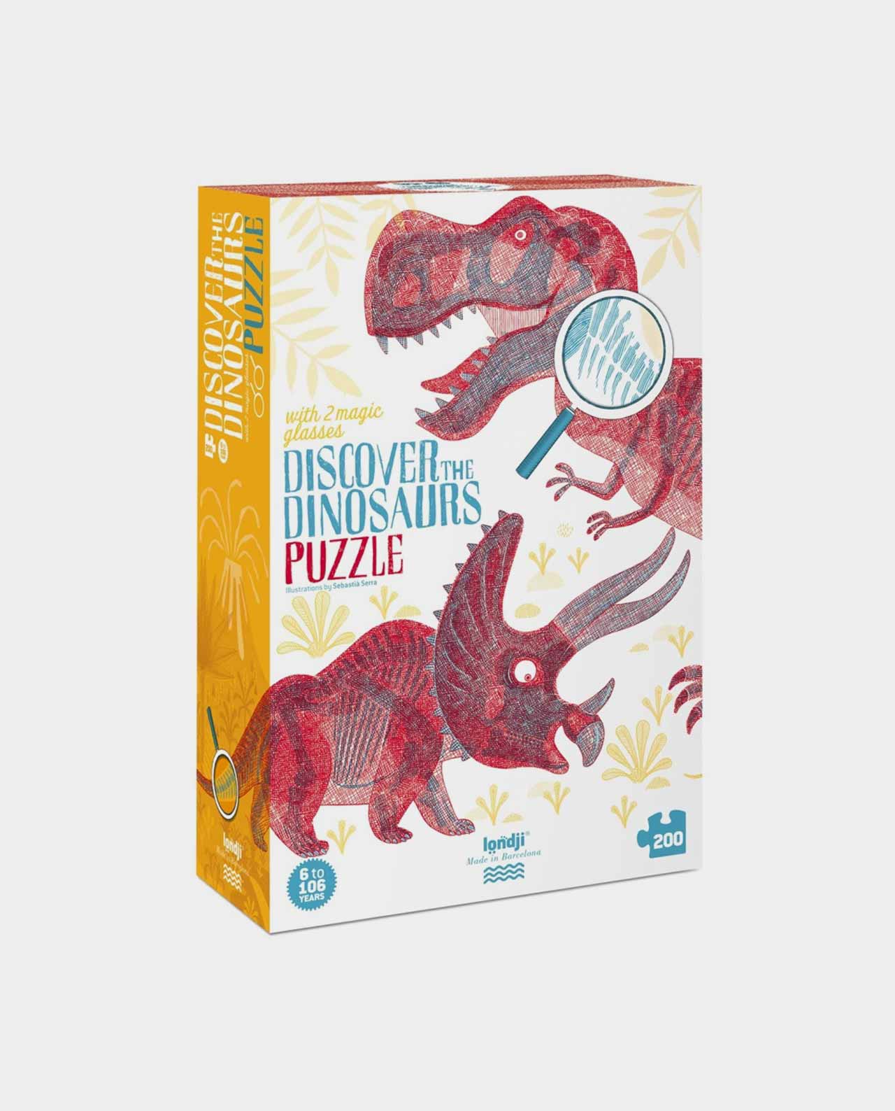 Mira a través de la lupa azul y viaja al jurásico con Londji. Descubrirás impresionantes Tiranosaurus rex, diplodocus y espinosaurus paseando en medio de volcanes.
