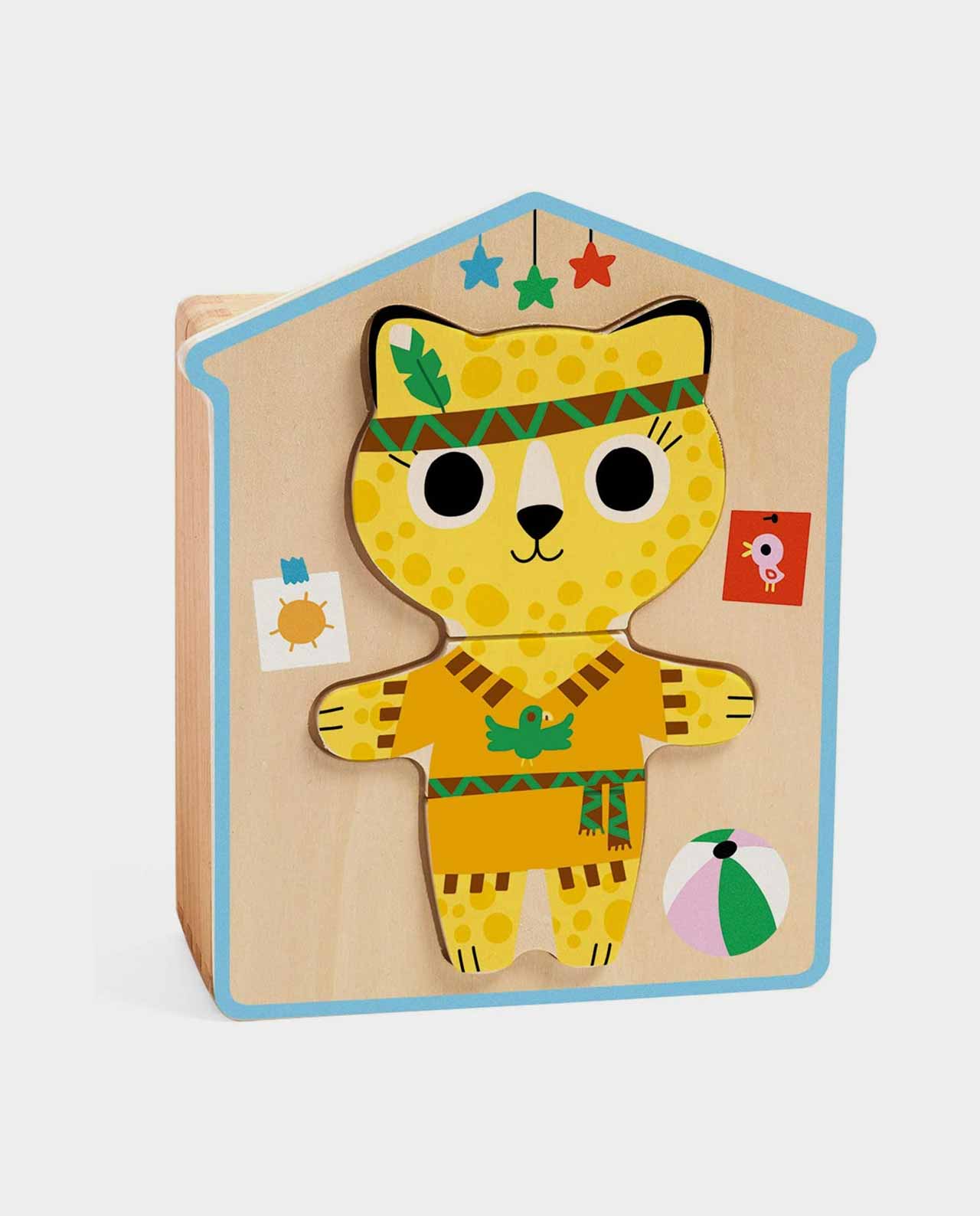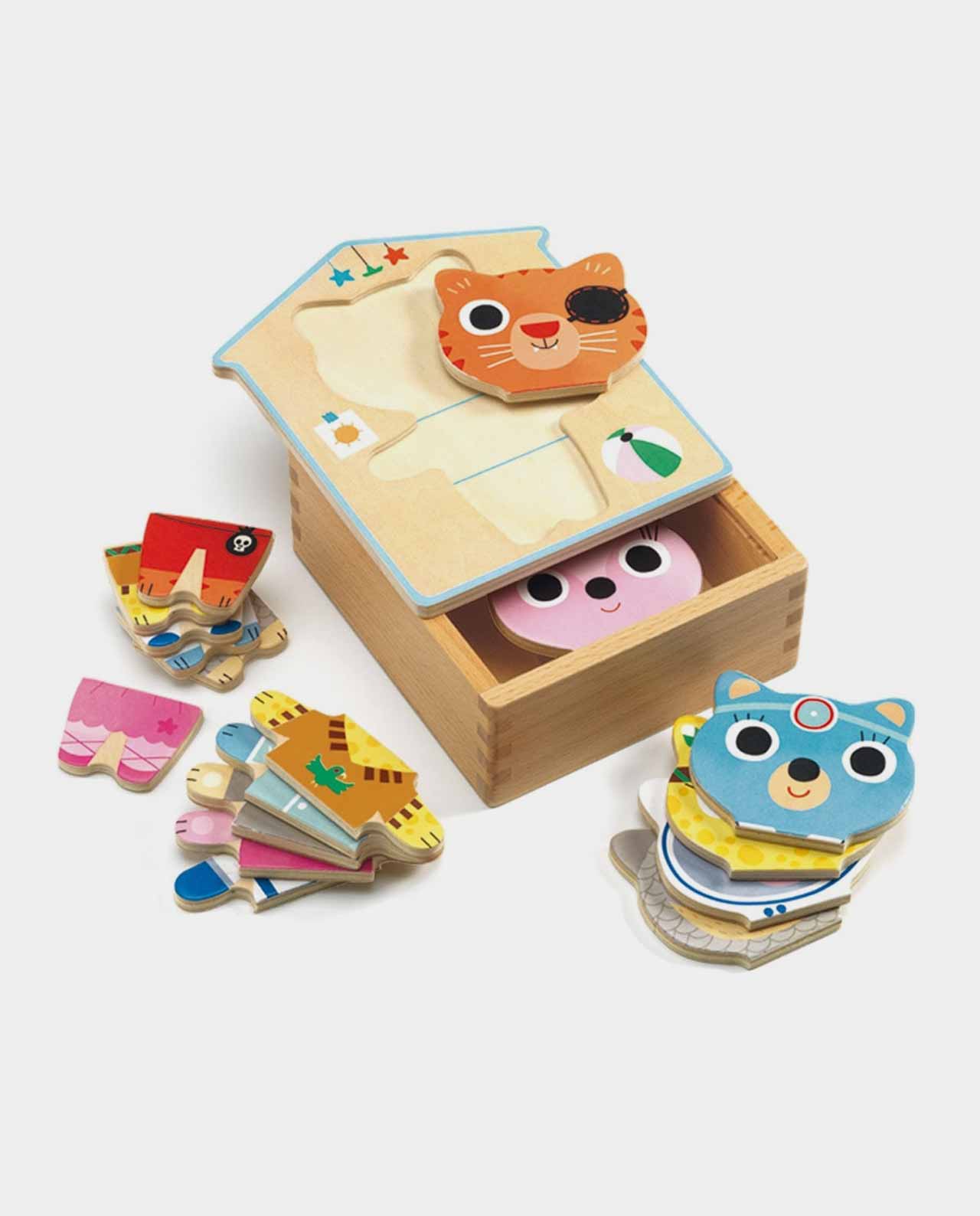 6 puzzles de gatitos de 3 piezas de madera cada uno, para empezar con puzzles sencillitos a partir de los 2 años. Viene con su cajita de madera para guardar las piezas y que no se pierda ninguna, con tapa donde encajarlas.
