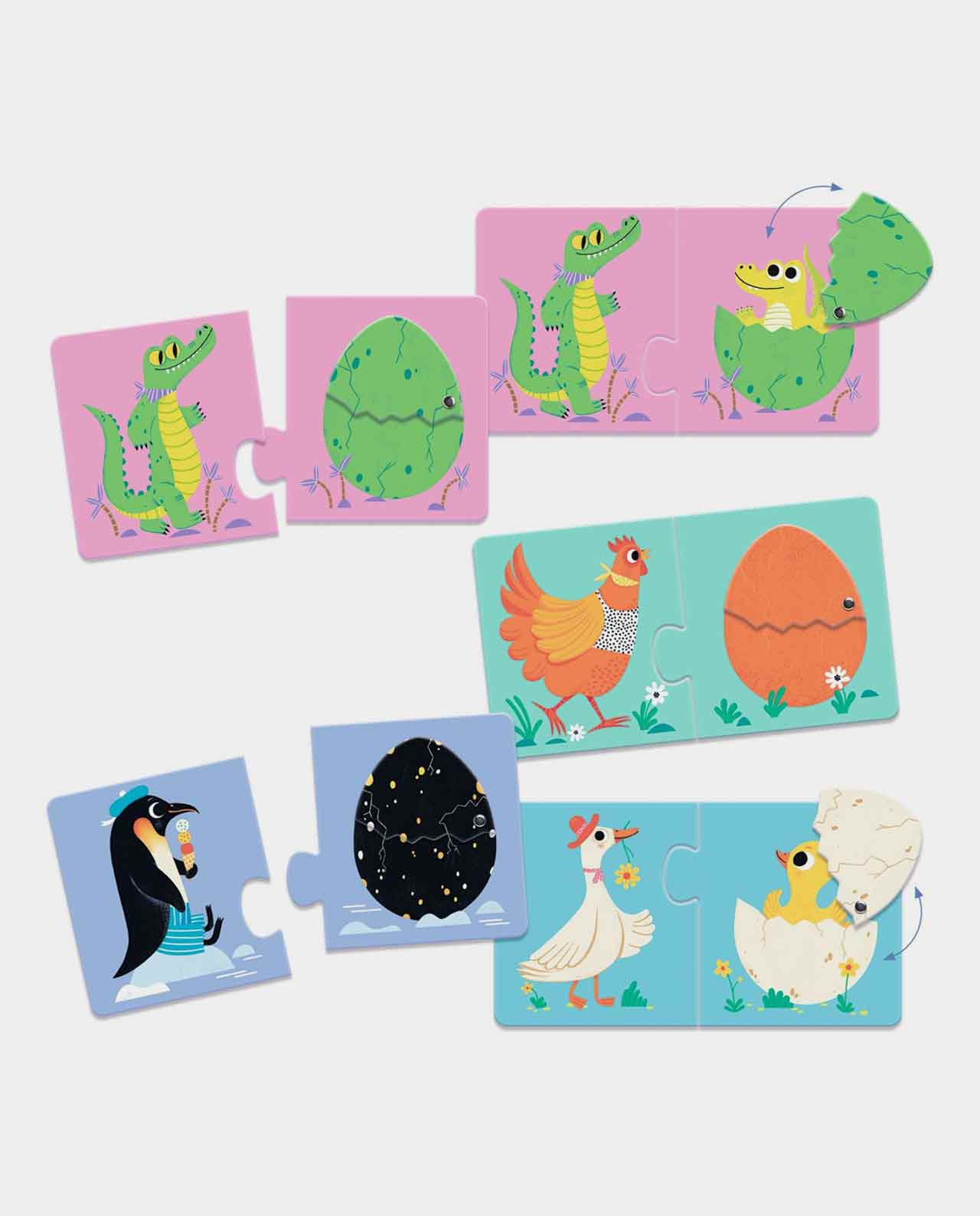 Un puzzle educativo animado en el que el peque asocia el animal con su huevo, y luego descubre al bebé escondido dentro: ¡sorpresa! Cada caja corresponde a una asociación, para que pueda entenderla y dominarla. Las piezas grandes son fáciles de manejar para las manos de los más pequeños y las cajas para guardarlos se pueden llevar a cualquier parte.