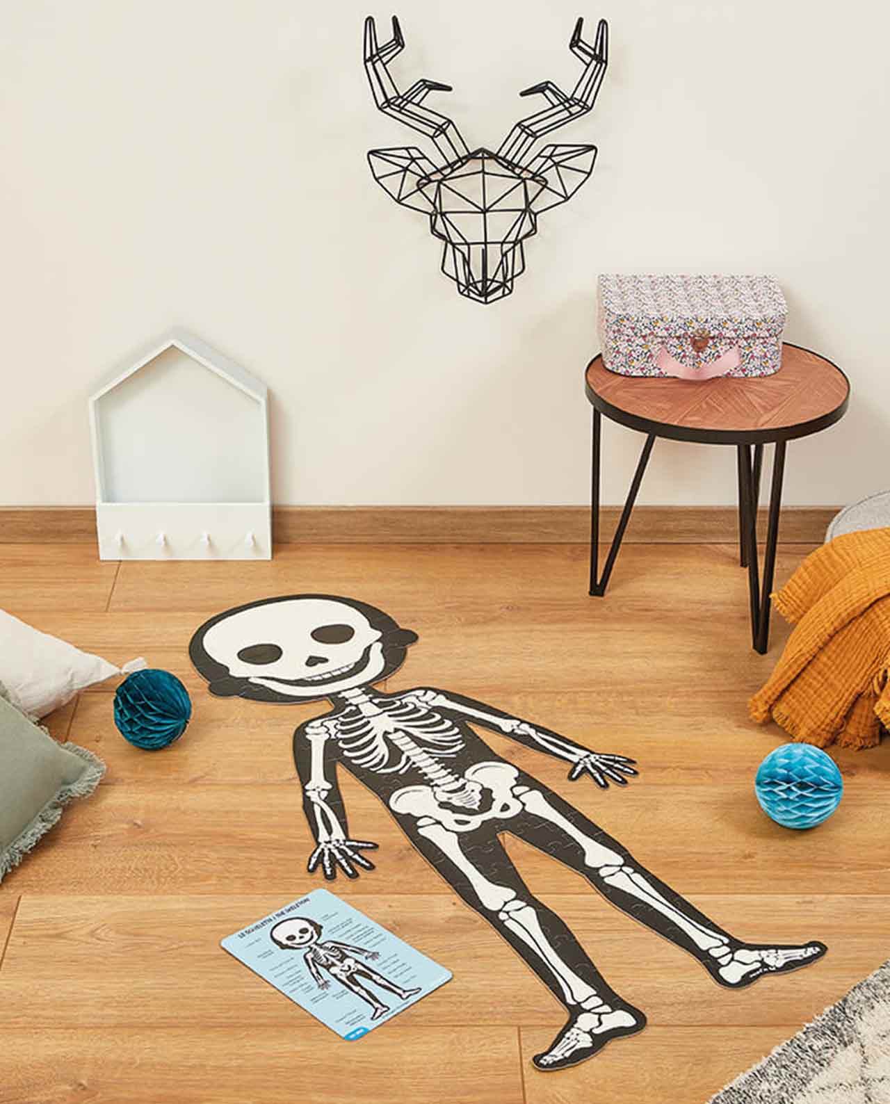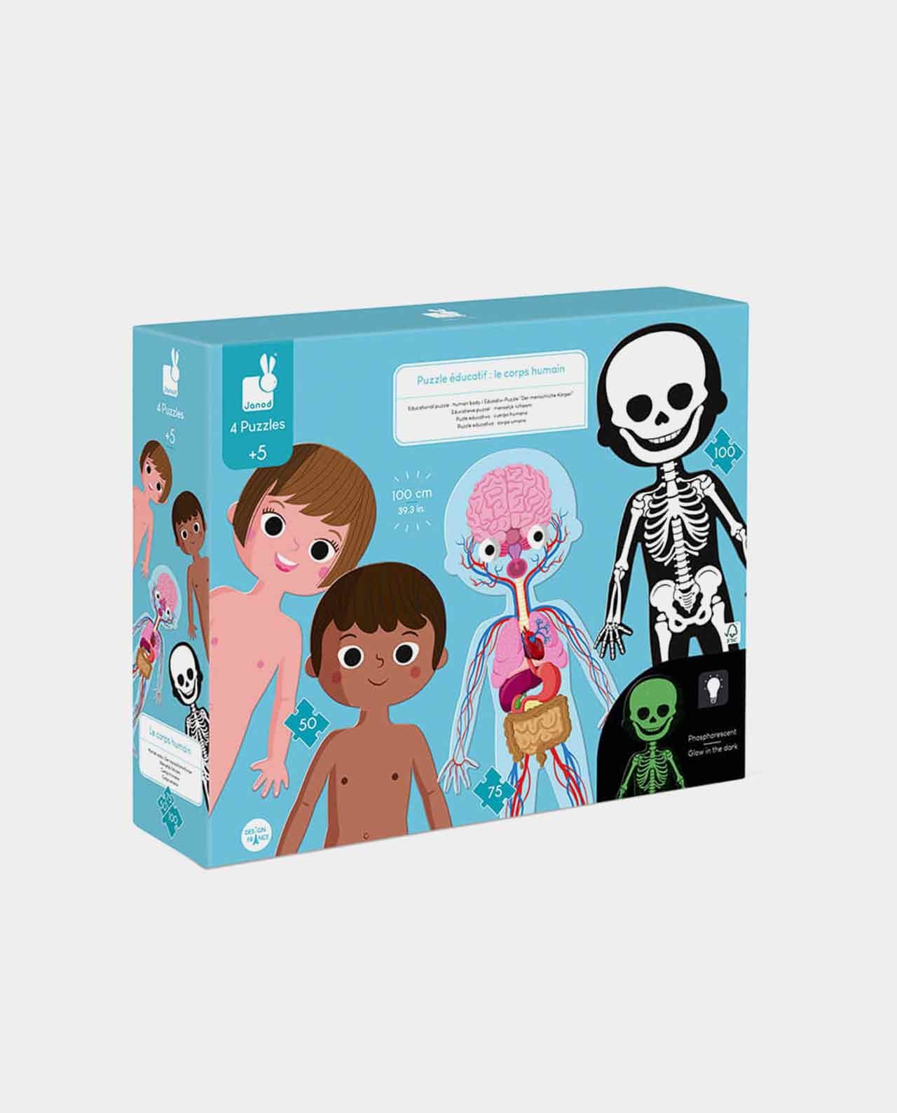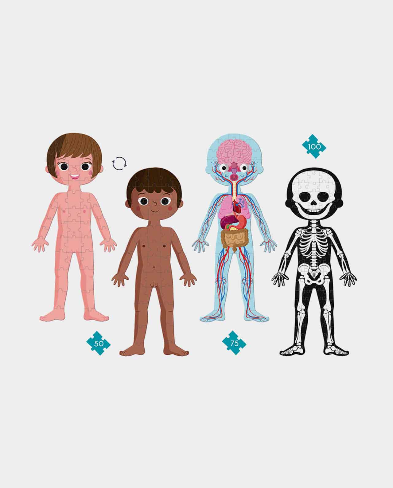 El estuche consta de un puzzle de doble cara de 50 piezas niña/niño, un puzle de 75 piezas de los órganos del cuerpo humano y un puzzle de 100 piezas fosforescente del esqueleto. Cada puzzle mide 1 metro de alto y viene con unas detalladas tarjetas educativas para ayudar a los niños a entender y conocer las distintas partes del cuerpo humano. Las tarjetas incluidas están disponibles en 12 idiomas: francés, inglés, alemán, holandés, polaco, ruso, español, portugués, catalán, vasco, eslovaco y checo.