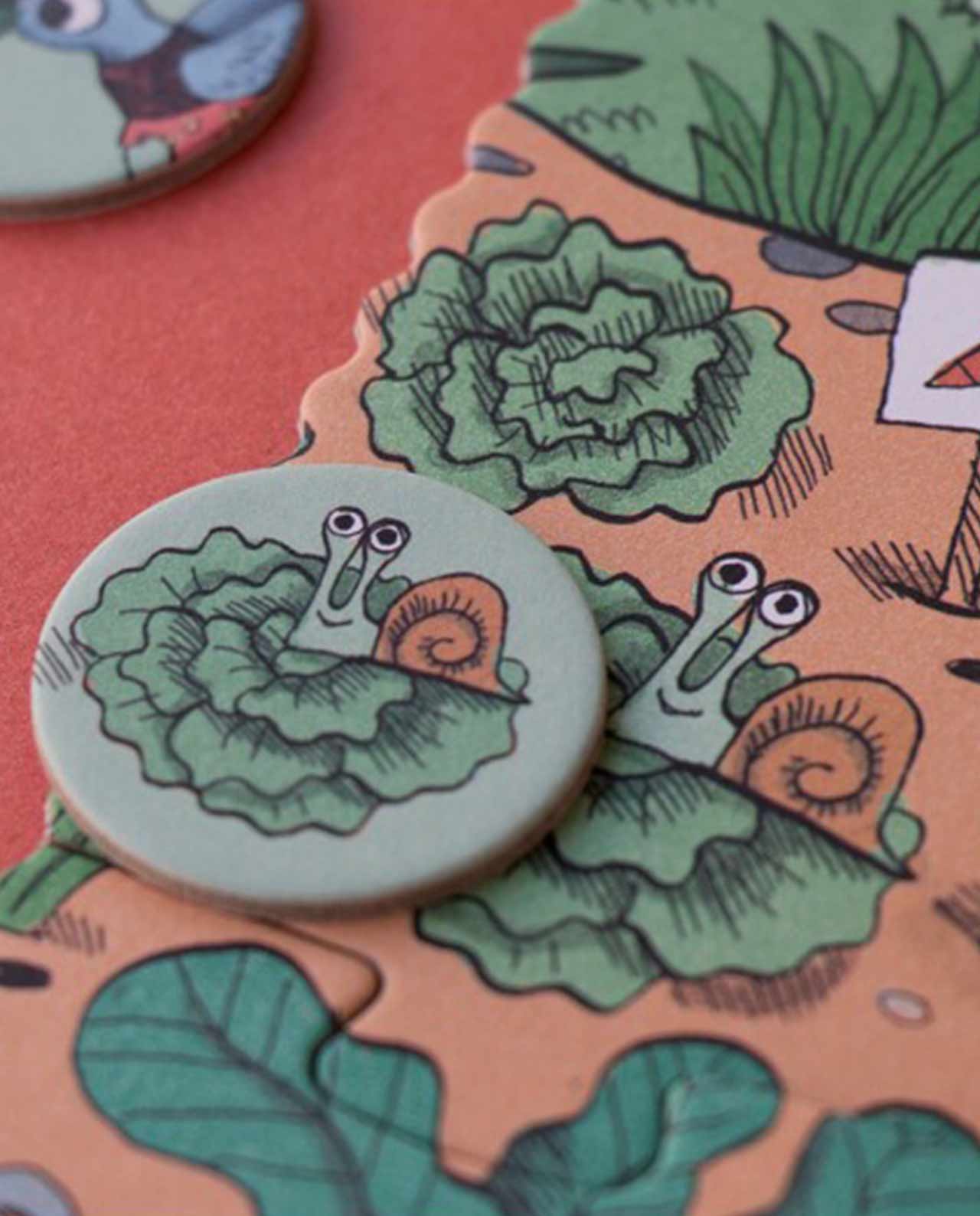 Un puzle de 24 piezas que se completa con un juego de observación. Una vez resuelto el puzle tenemos 24 fichas que iremos encontrando en la imagen, estimulando el descubrimiento del mundo de la huerta, las frutas y las verduras.