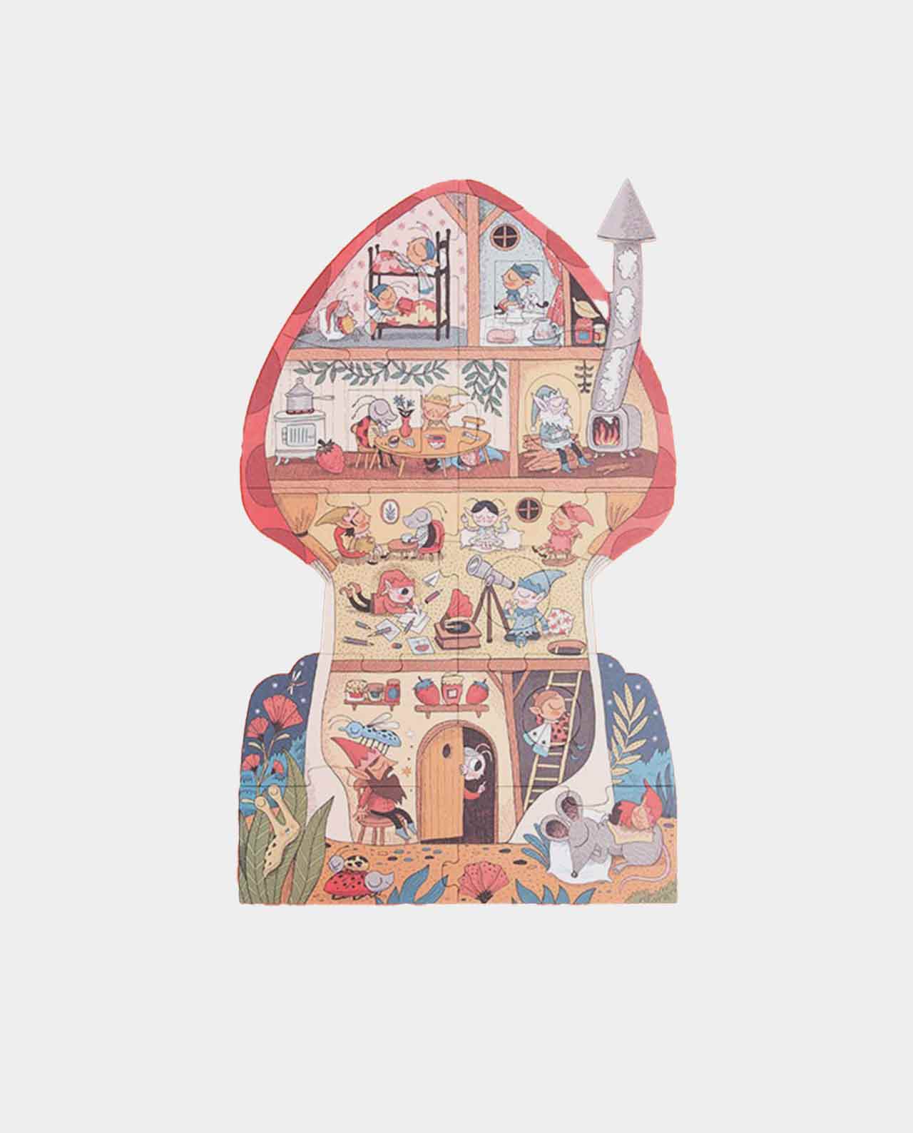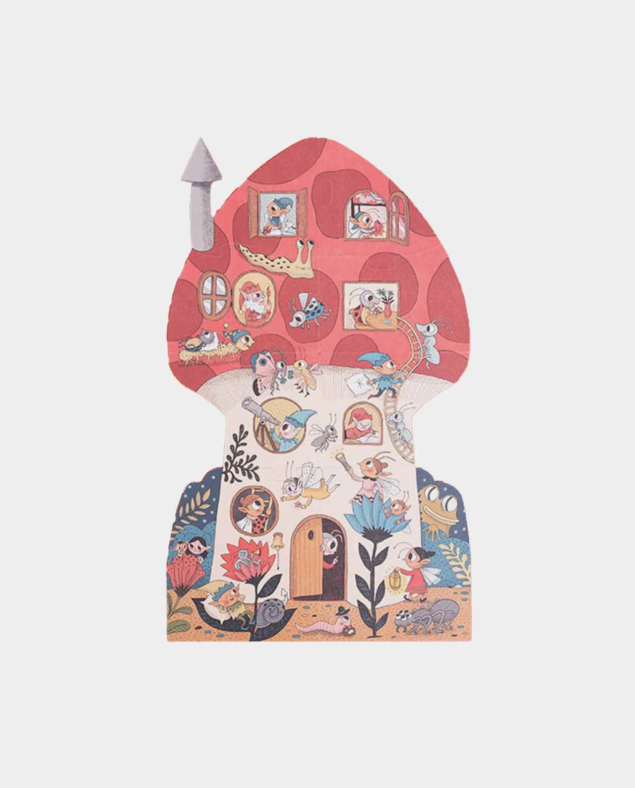 En una cara encontramos el exterior de la seta y en la otra el interior. Una vez montada la casa seta (10 piezas) el niño podrá ir encajando las piezas dentro de la casa (8 piezas), haciendo dormir los diferentes personajes, a la vez que va familiarizándose con el hábito de ir a dormir. Las piezas son muy grandes, pensadas para manos pequeñas.