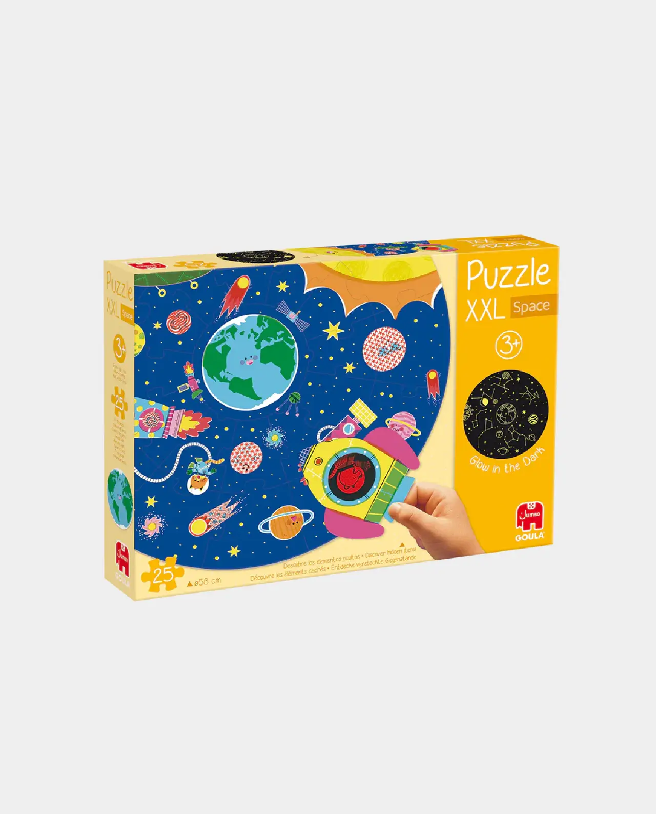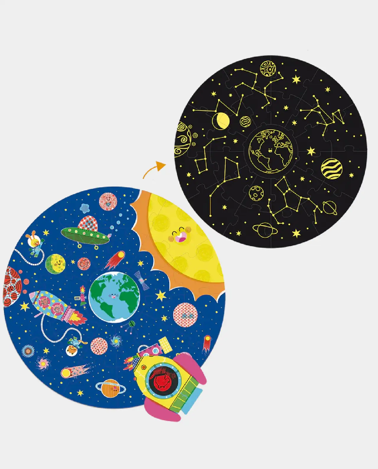 Monta este increíble puzzle circular pieza a pieza; busca los elementos escondidos en el espacio; y, por último, ¡utiliza las piezas traslúcidas para descubrir los secretos mejor guardados del espacio!