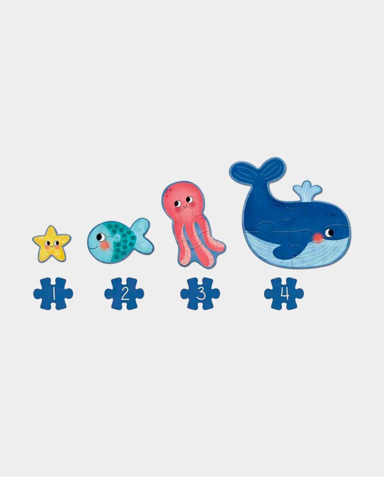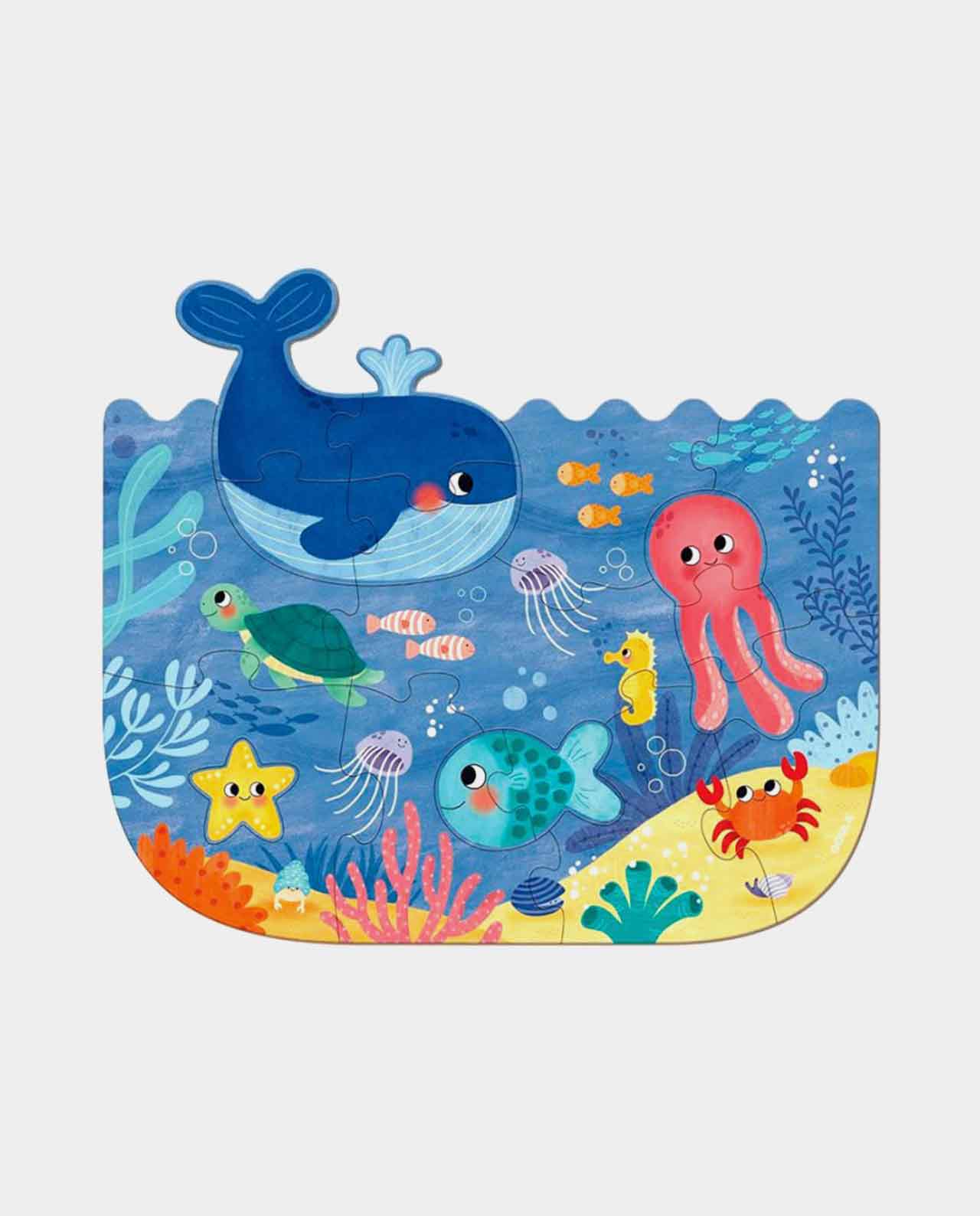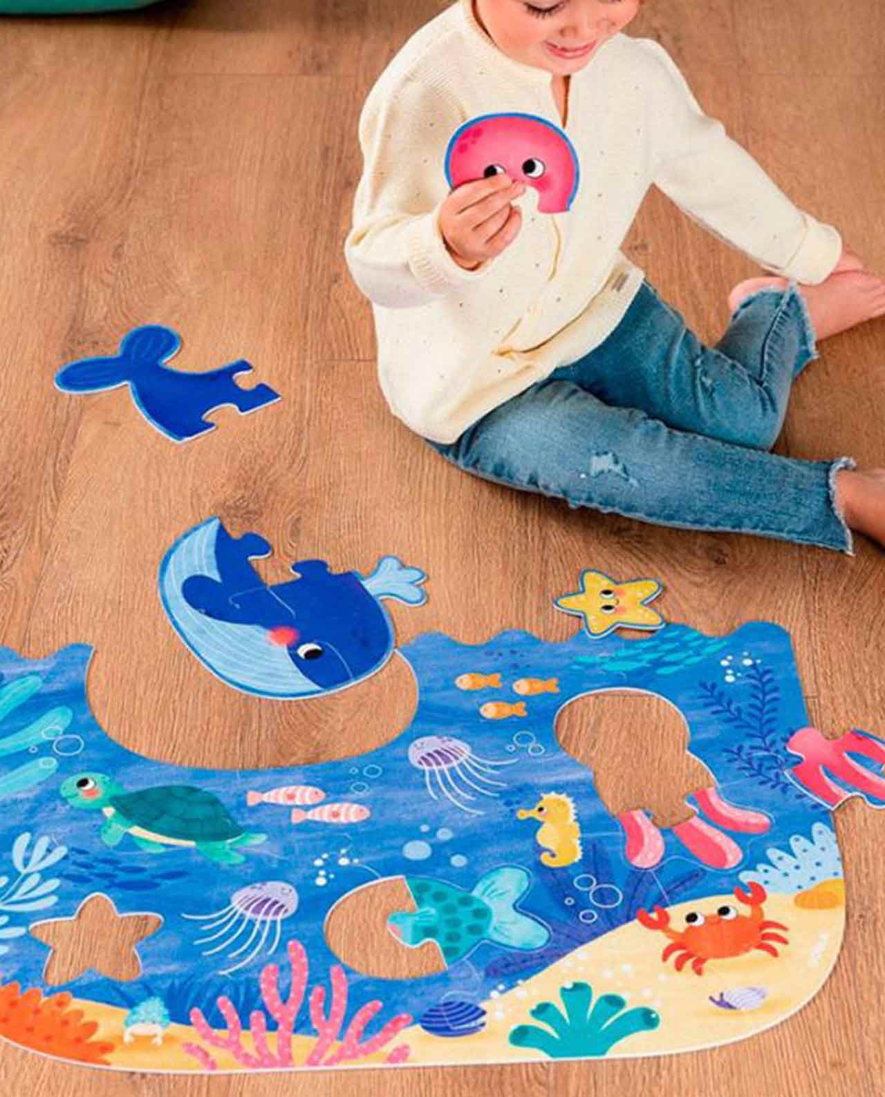 Puzzle XXL Oceano con figuras del mar de la marca Goula, súper divertidos, donde encontrarás 18 piezas para formar un desfile de animales: una estrella de mar, un pez, un pulpo y una ballena. Además estos puzzles pueden montarse también por separado.