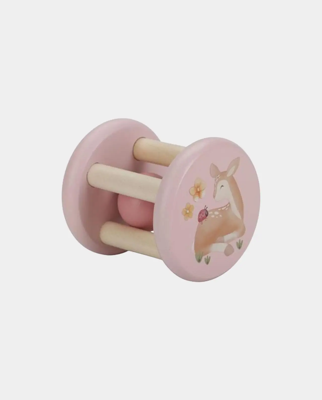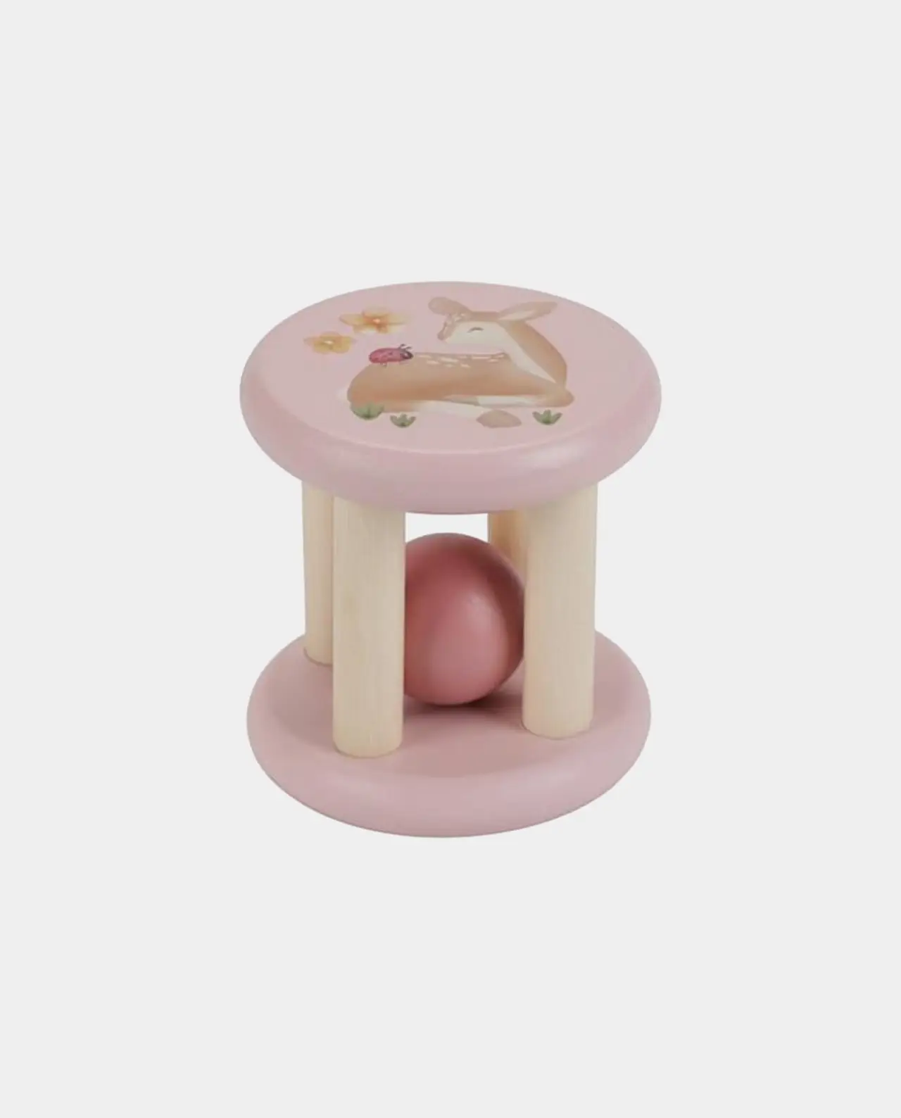 Este Roller cilíndrico de la marca Little Dutch tiene dentro una pequeña bola de madera maciza para desarrollar las habilidades auditivas y de atención del recién nacido.