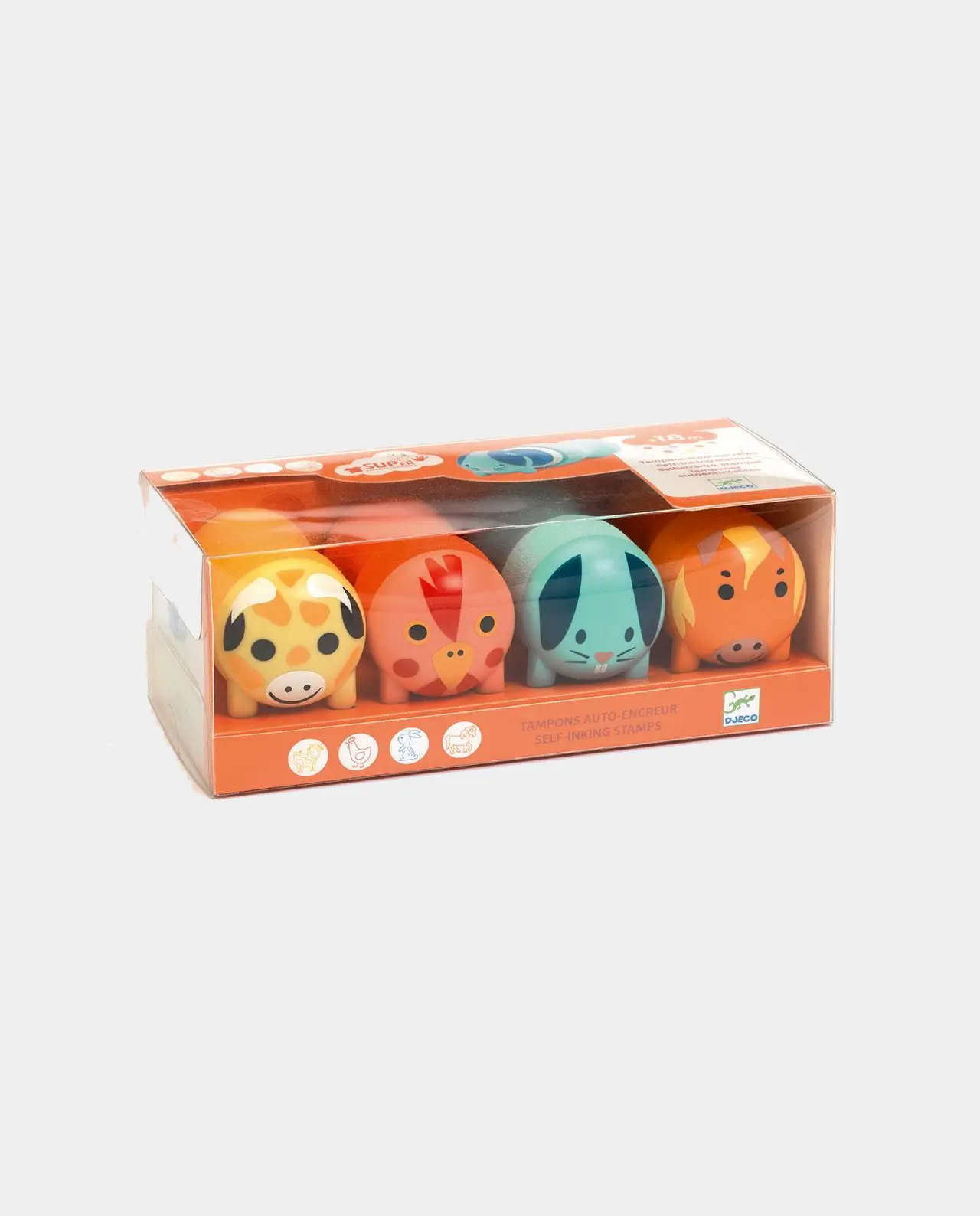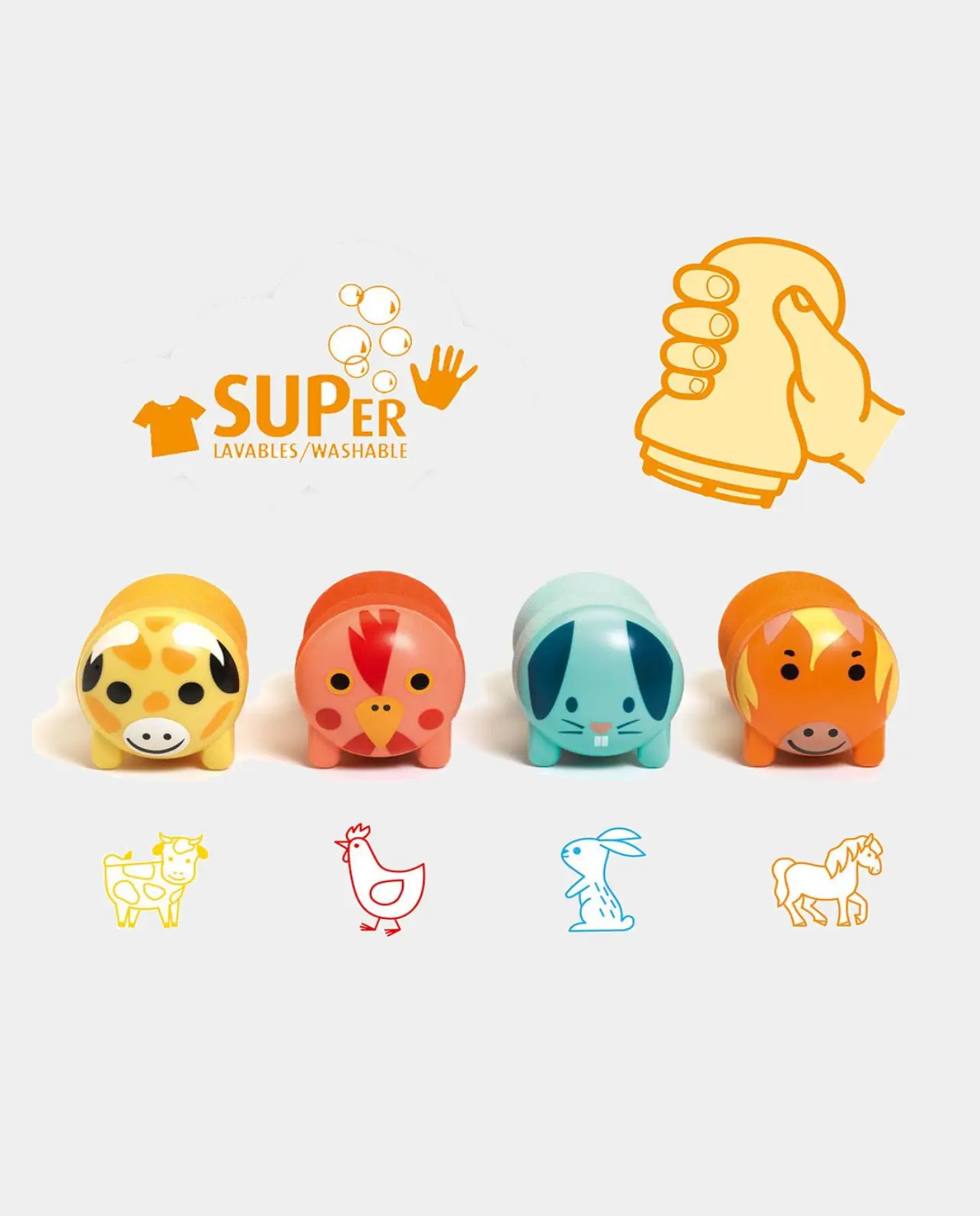 Divertidos sellos de animales ergonómicos y autoentintables creados por Djeco. Diseñado para manos pequeñas con un mango de espuma para que tengan comodidad al agarre. Son 4 sellos cada animal pertenece a un color.