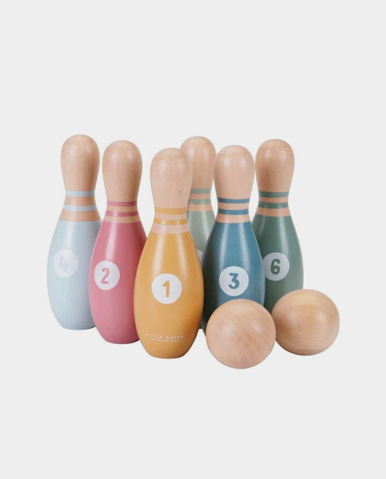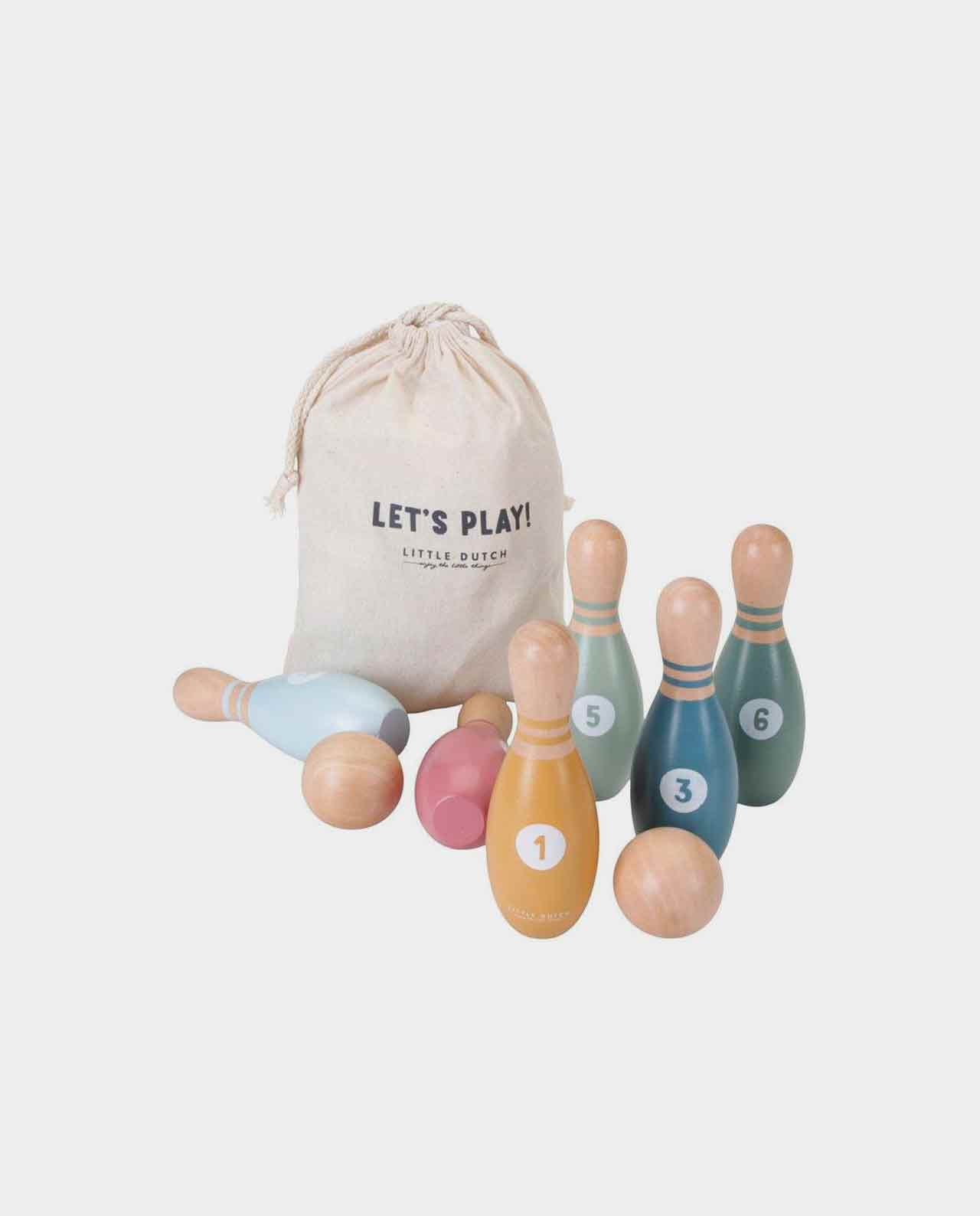 Precioso set de bolos hechos 100% de madera FSC para pasar horas de juego en familia. Fácil de transportar con su bolsa de lona los podrás llevar de viaje, a casa de los abuelos e incluso al campo para que la diversión no pare.