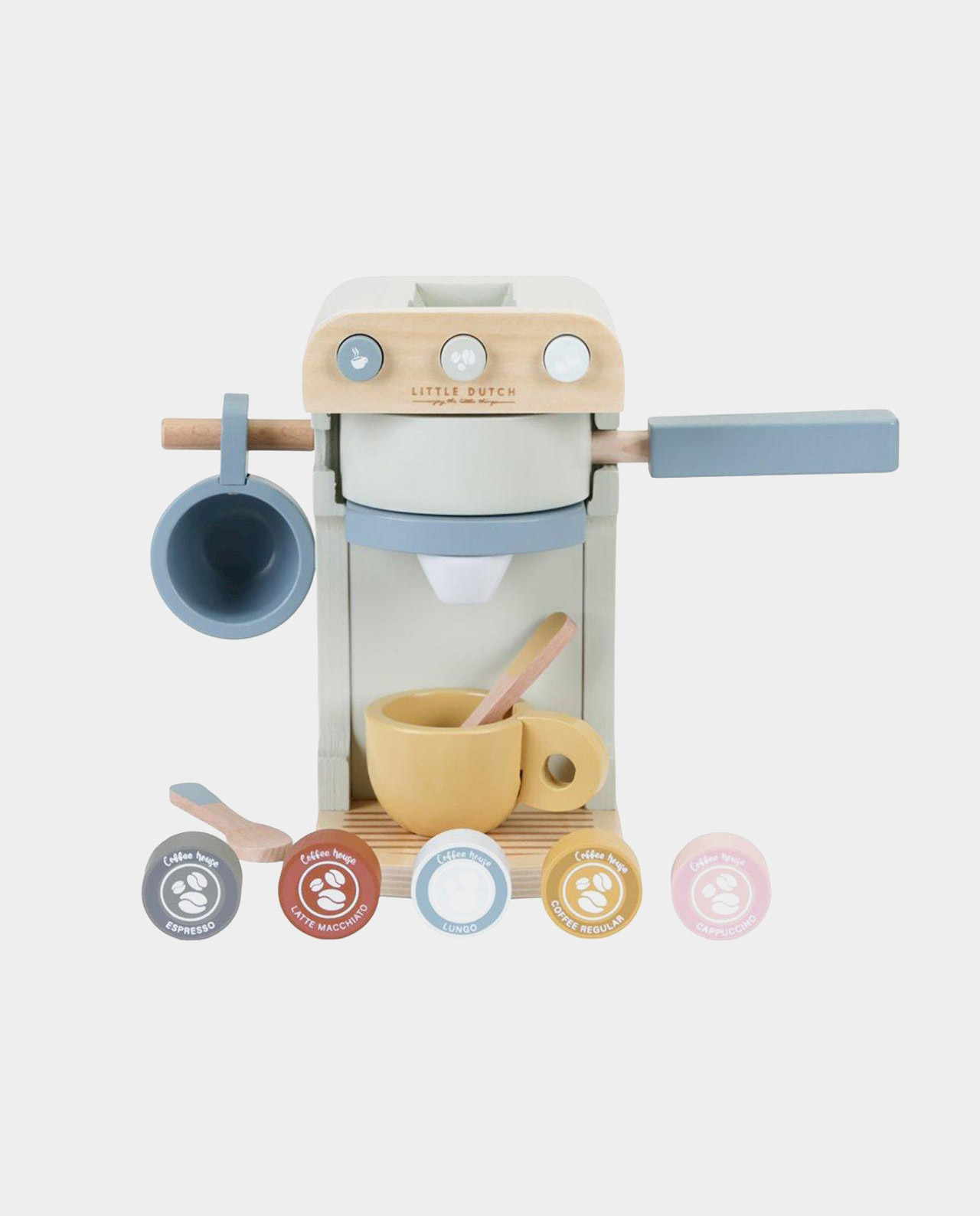 Set de cafetera de cápsulas, con accesorios para jugar a elaborar deliciosos cafés y poder sentarse con ellos un ratito para charlar junto a un café o té.