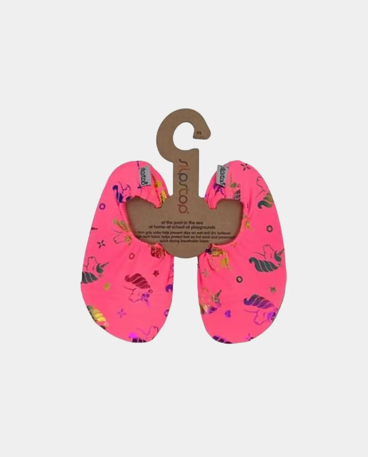 SlipStop es una zapatilla antideslizantes tipo escarpines para niños, de agarre firme, ligeras, flexibles y antideslizantes para usar en la piscina, en la playa, en casa, en los parques de bolas, en baile, kárate o gimnasio, etc. Están pensados para evitar resbalones en suelos mojados o húmedos, a la vez que protege el pies de superficies calientes y rugosas.