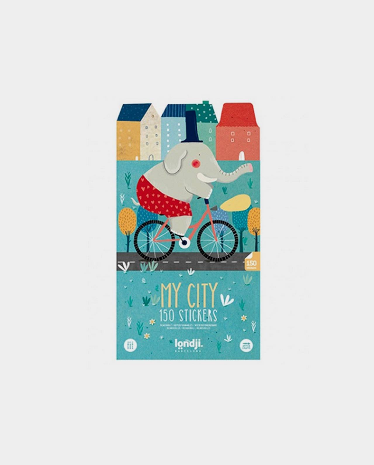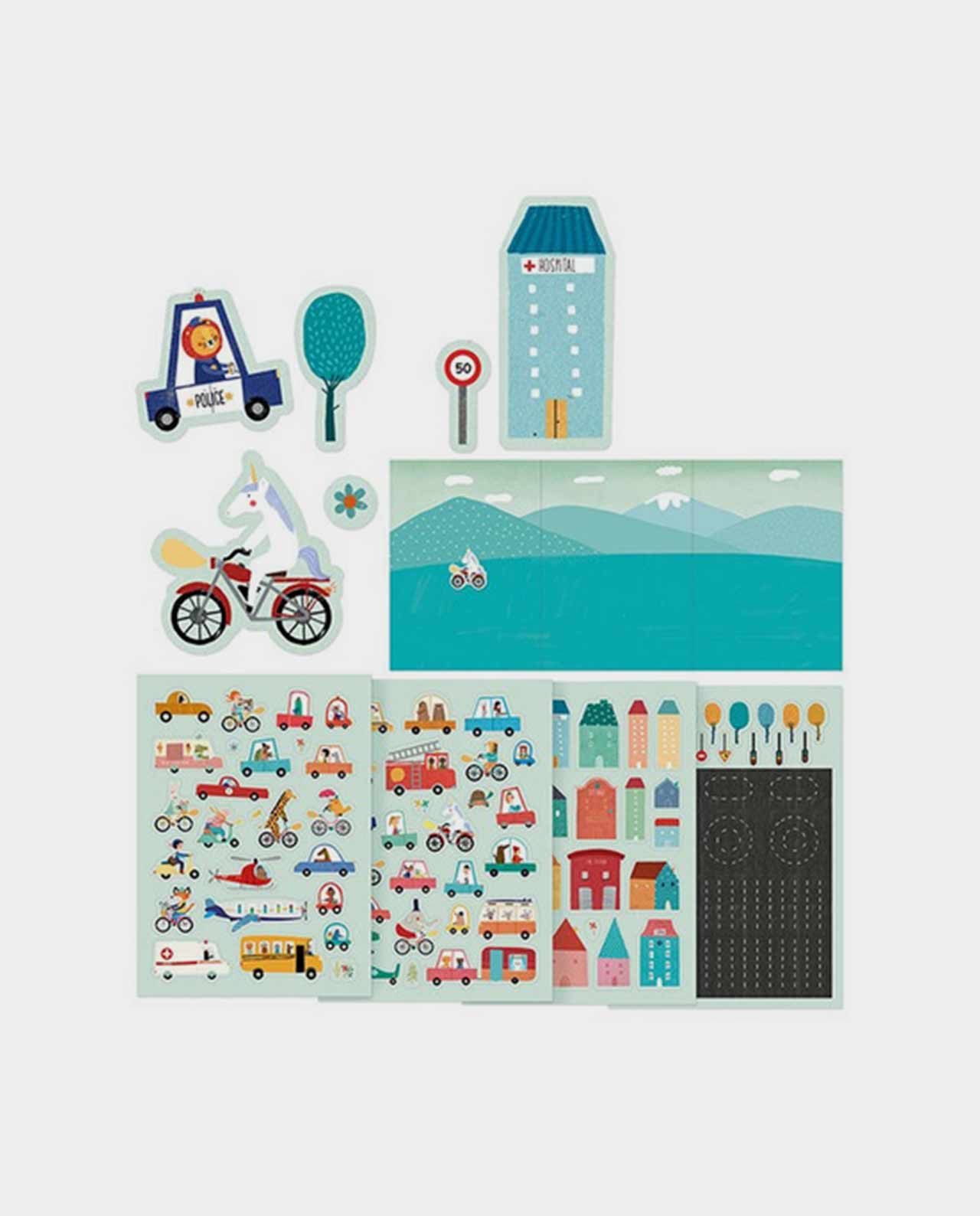 Un juego de 150 pegatinas removibles de vehículos con diferentes personajes, casas, plantas y árboles, carreteras y señales de tráfico para que construyas la ciudad de tus sueños sobre la escena que tu elijas!