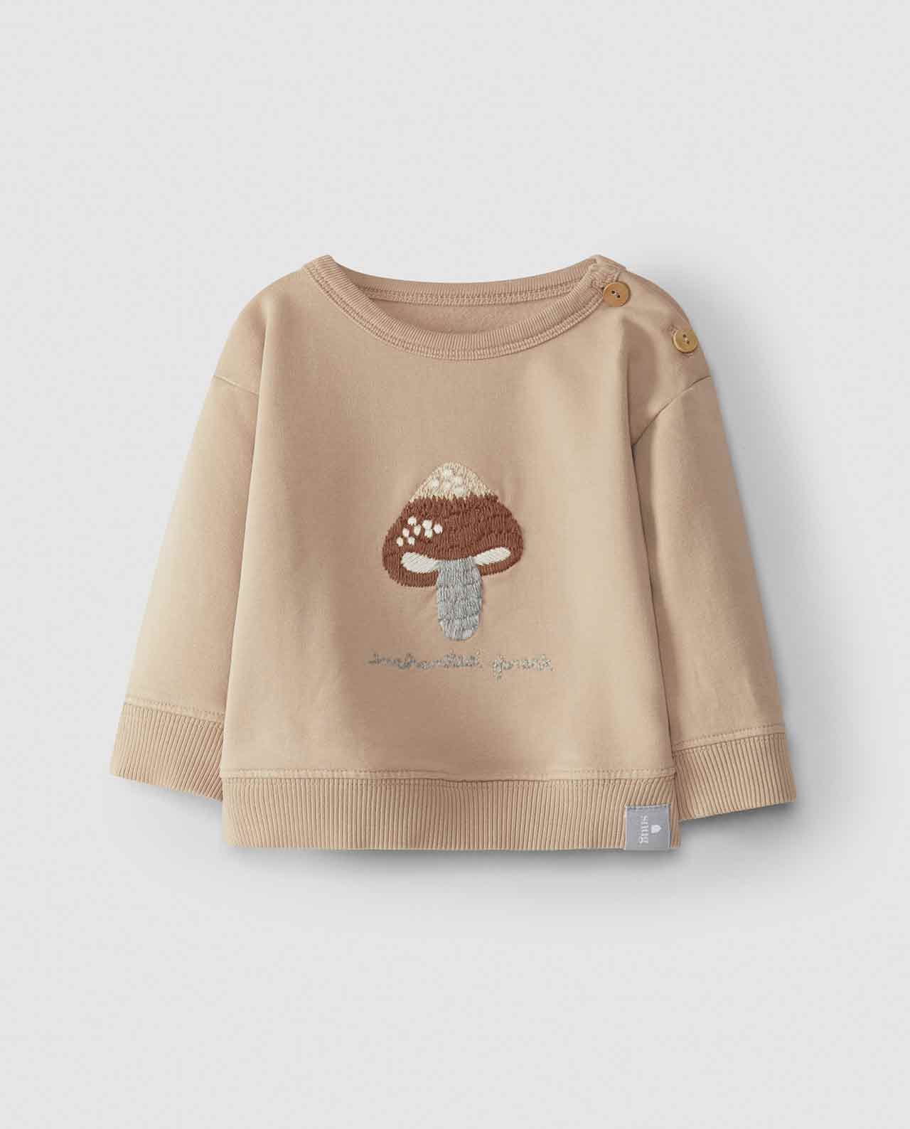 Jersey de felpa de algodón orgánico con bordado hecho a mano en hilo de lana. Acabados de punto acanalado. Cierra con botones de madera en el hombro.