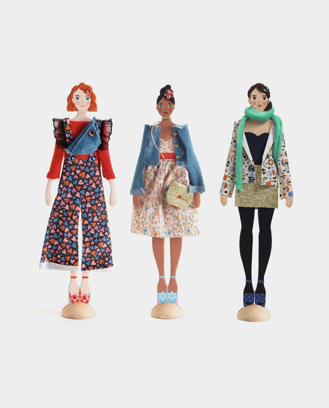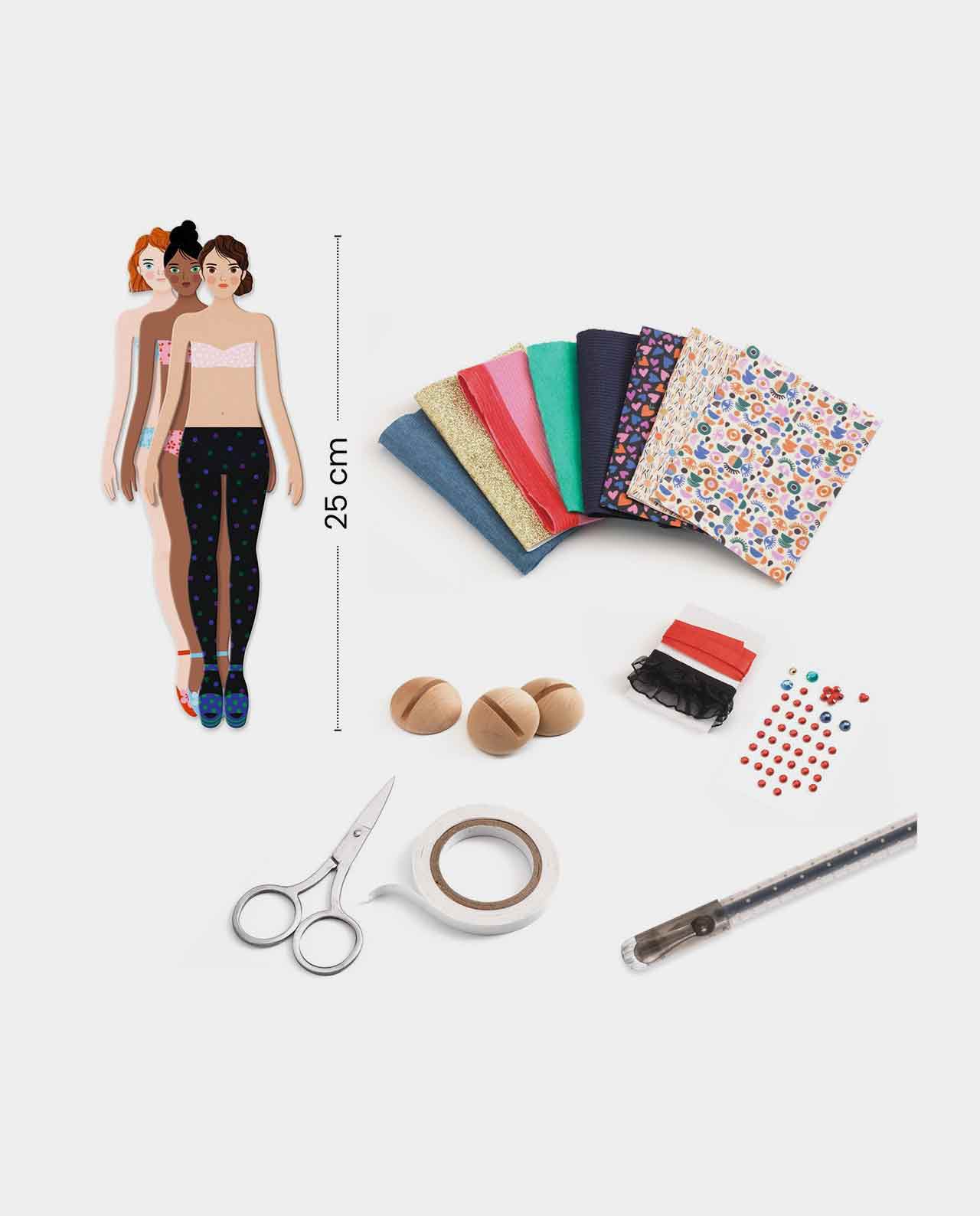 Un set de Djeco ideal para jóvenes estilistas con telas reales para recortar. Utiliza las instrucciones como guía, sigue los patrones y simplemente ensambla las piezas sin coser. Ahora sólo tienes que decorar los conjuntos con los numerosos accesorios que se incluyen y lucir tus diseños en las muñecas de pie.