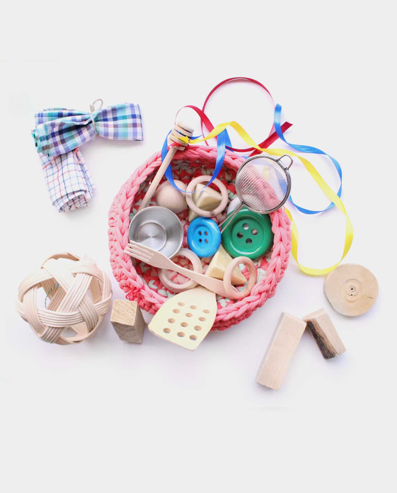 Está aconsejado colocar entre 10 y 30 objetos que debemos ir renovando constantemente, para mantener la curiosidad y el misterio con el bebé, y por otro lado para ofrecer variedad de cosas que explorar e ir adaptándolas a su interés conforme va creciendo.