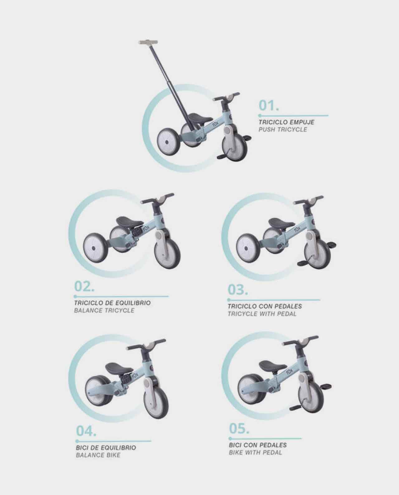 Se añaden pedales en la rueda delantera para que tu pequeño empiece a practicar el pedaleo y coordine sus movimientos mientras sigue disfrutando de la estabilidad del triciclo. - Fase 4: Bicicleta de equilibrio sin pedales