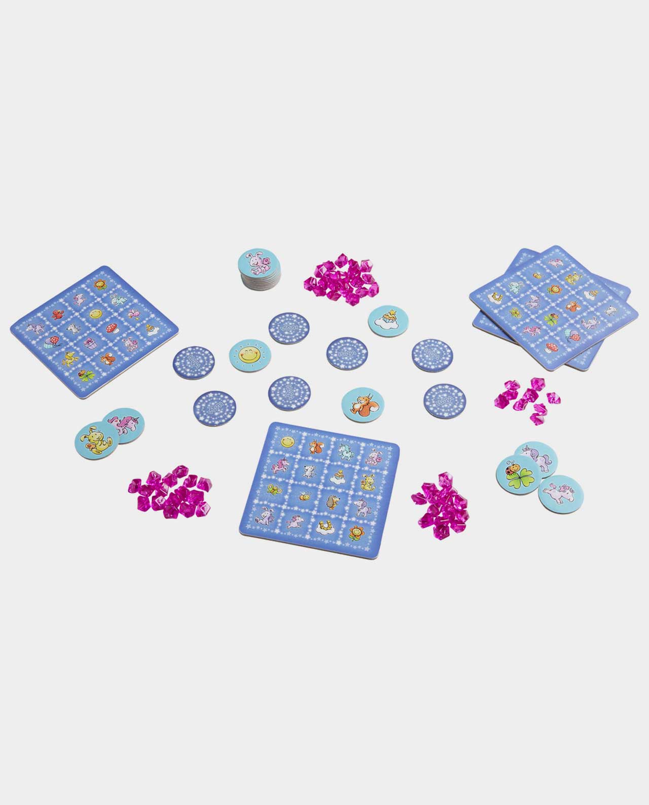 Unicornio Destello y sus amigos juegan hoy al bingo. ¿Quién quiere jugar con ellos y comprobar si tiene en su cartón el dibujo de las fichas destapadas? Aquí una divertida mariquita, ¡y allí un pequeño erizo! Para cada dibujo, se puede colocar un cristal de nube sobre el cartón. El primero que consiga una fila de cuatro cristales, gana.